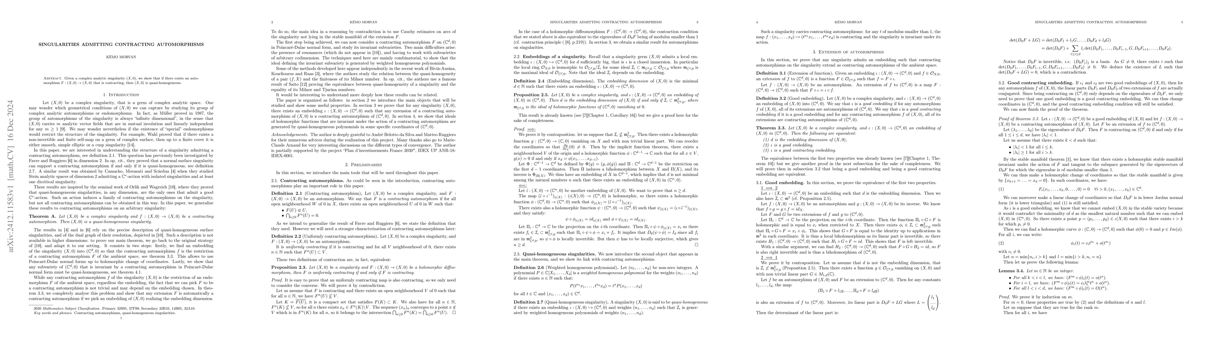 This paper demonstrates that complex analytic singularities admitting a contracting automorphism are quasi-homogeneous. The result establishes a connection between the existence of contracting automorphisms and the quasi-homogeneity of the singularity.