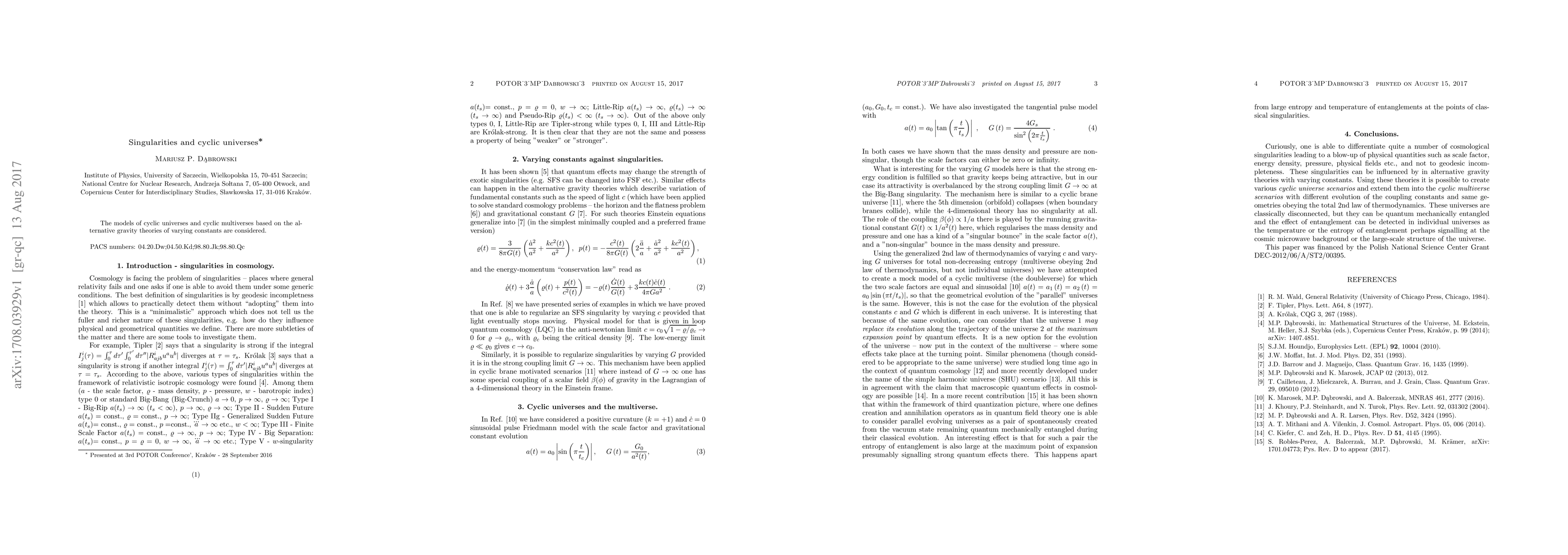 Summary: This paper explores cyclic universe and multiverse models underpinned by alternative gravity theories featuring varying constants, investigating their implications for cosmological singularities.