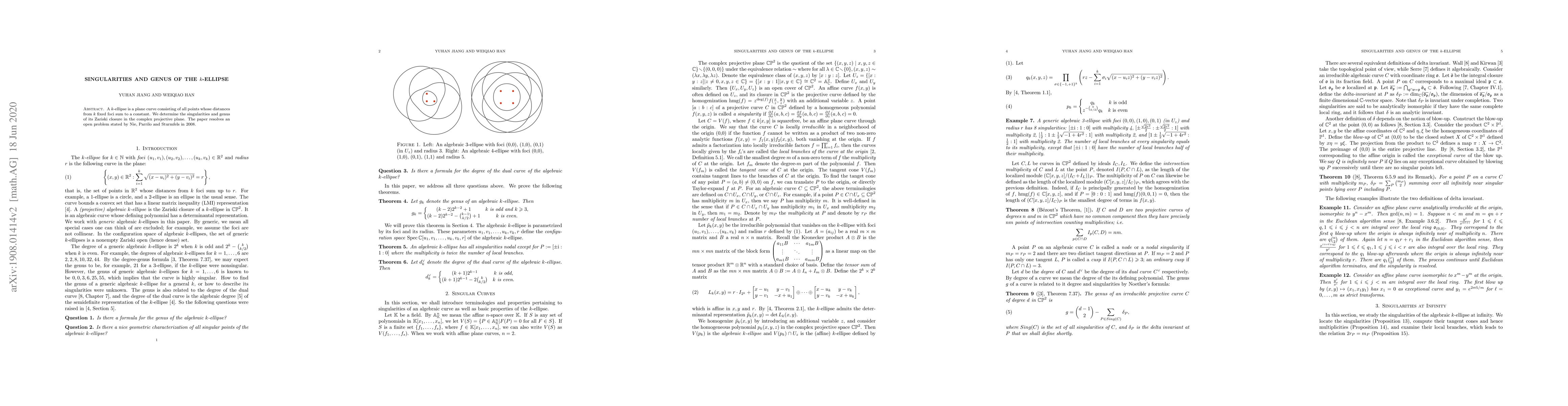 A k-ellipse is a plane curve consisting of all points whose distances from k fixed foci sum to a constant. We determine the singularities and genus of its Zariski closure in the complex projective plane. The paper resolves an open problem stated by Nie, Parrilo and Sturmfels in 2008.