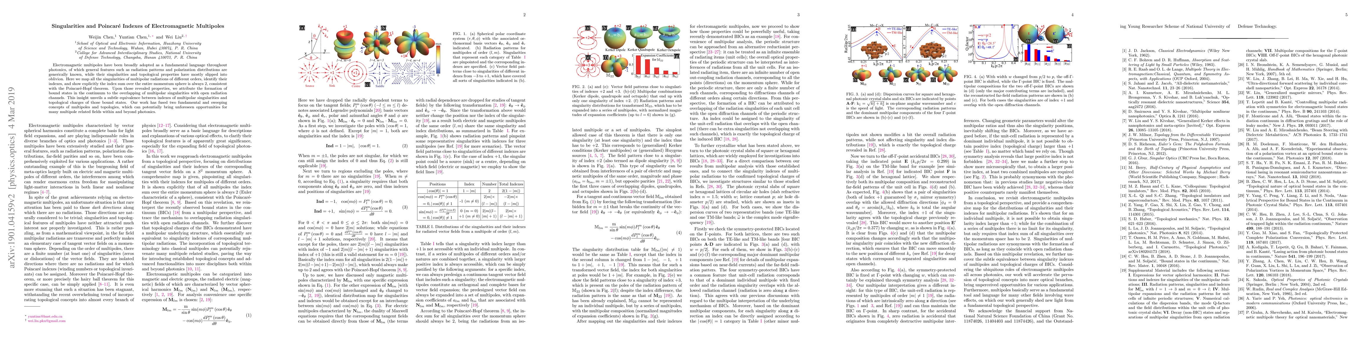 This paper investigates the singularities and Poincaré indexes of electromagnetic multipoles, revealing that the sum of these indexes over the momentum sphere is always 2, consistent with the Poincaré-Hopf theorem. It connects the topological properties of multipolar singularities to the formation of bound states in the continuum, showing they share the same topological charges.
