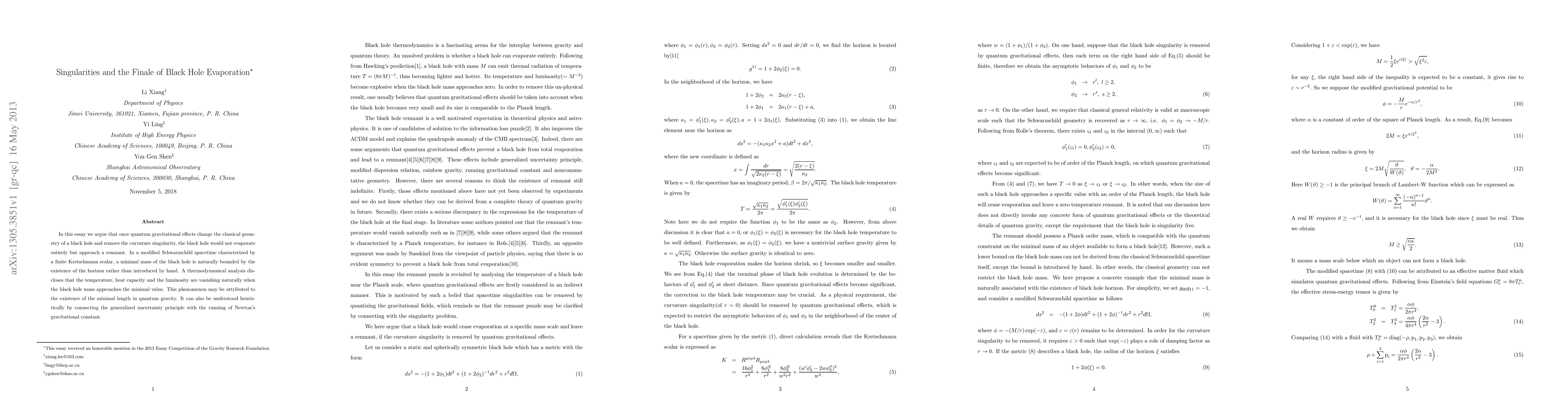 In this essay we argue that once quantum gravitational effects change the classical geometry of a black hole and remove the curvature singularity, the black hole would not evaporate entirely but approach a remnant. In a modified Schwarzschild spacetime characterized by a finite Kretschmann scalar, a minimal mass of the black hole is naturally bounded by the existence of the horizon rather than introduced by hand. A thermodynamical analysis discloses that the temperature, heat capacity and the luminosity are vanishing naturally when the black hole mass approaches the minimal value. This phenomenon may be attributed to the existence of the minimal length in quantum gravity. It can also be understood heuristically by connecting the generalized uncertainty principle with the running of Newton's gravitational constant.