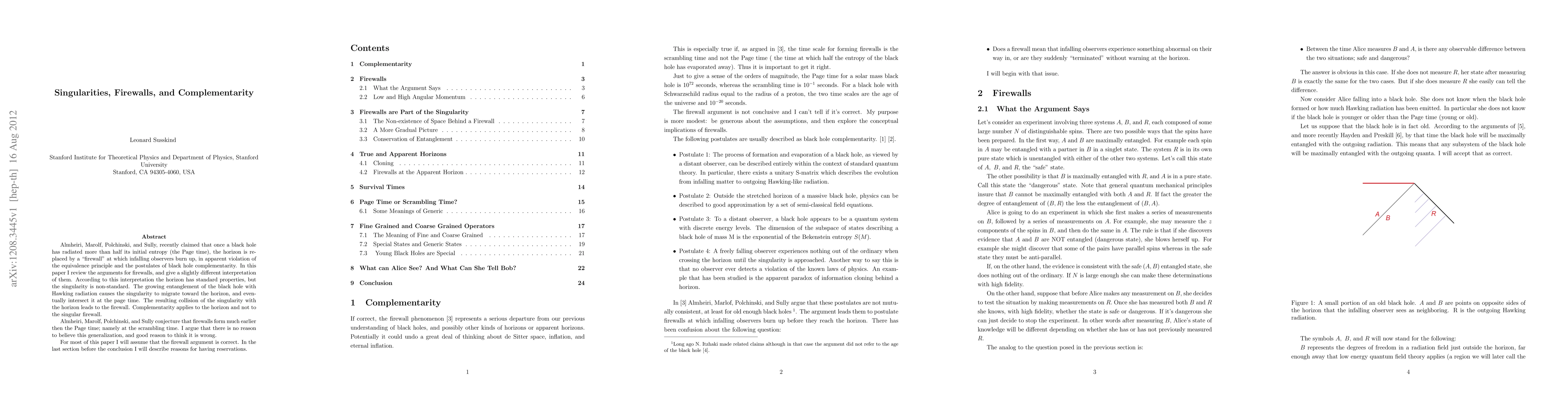Almheiri, Marolf, Polchinski, and Sully, recently claimed that once a black hole has radiated more than half its initial entropy (the Page time), the horizon is replaced by a "firewall" at which infalling observers burn up, in apparent violation of the equivalence principle and the postulates of black hole complementarity. In this paper I review the arguments for firewalls, and give a slightly different interpretation of them. According to this interpretation the horizon has standard properties, but the singularity is non-standard. The growing entanglement of the black hole with Hawking radiation causes the singularity to migrate toward the horizon, and eventually intersect it at the page time. The resulting collision of the singularity with the horizon leads to the firewall. Complementarity applies to the horizon and not to the singular firewall. Almheiri, Marolf, Polchinski, and Sully conjecture that firewalls form much earlier then the Page time; namely at the scrambling time. I argue that there is no reason to believe this generalization, and good reason to think it is wrong. For most of this paper I will assume that the firewall argument is correct. In the last section before the conclusion I will describe reasons for having reservations.