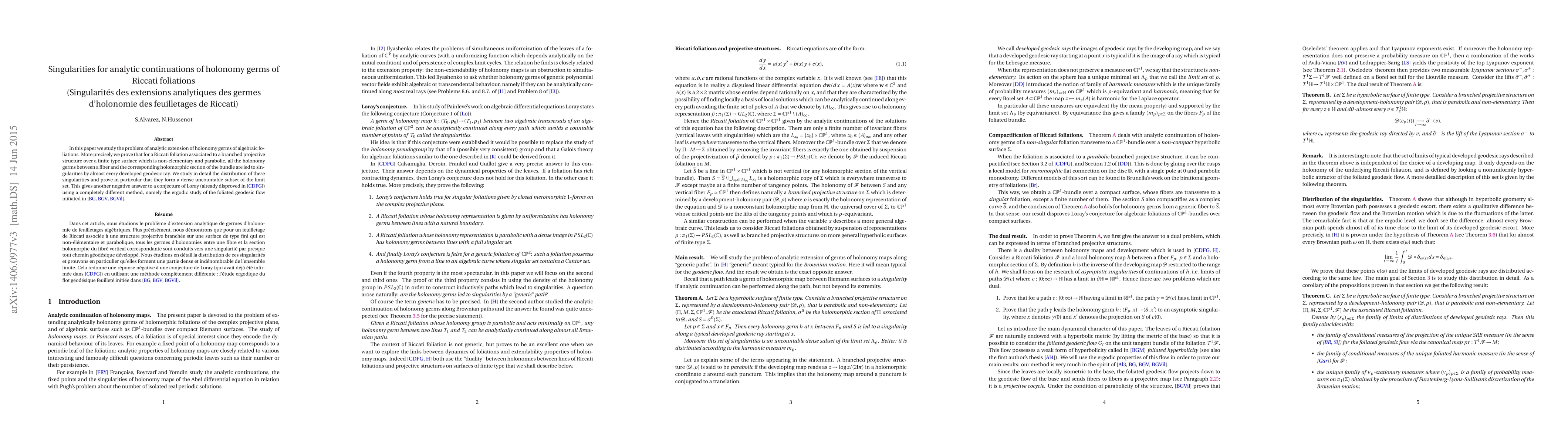 This paper investigates the analytic continuation of holonomy germs for Riccati foliations, proving that almost every developed geodesic ray leads to singularities in these germs. The study reveals that these singularities are dense, uncountable, and included in the limit set, thus providing a negative resolution to Loray's conjecture.