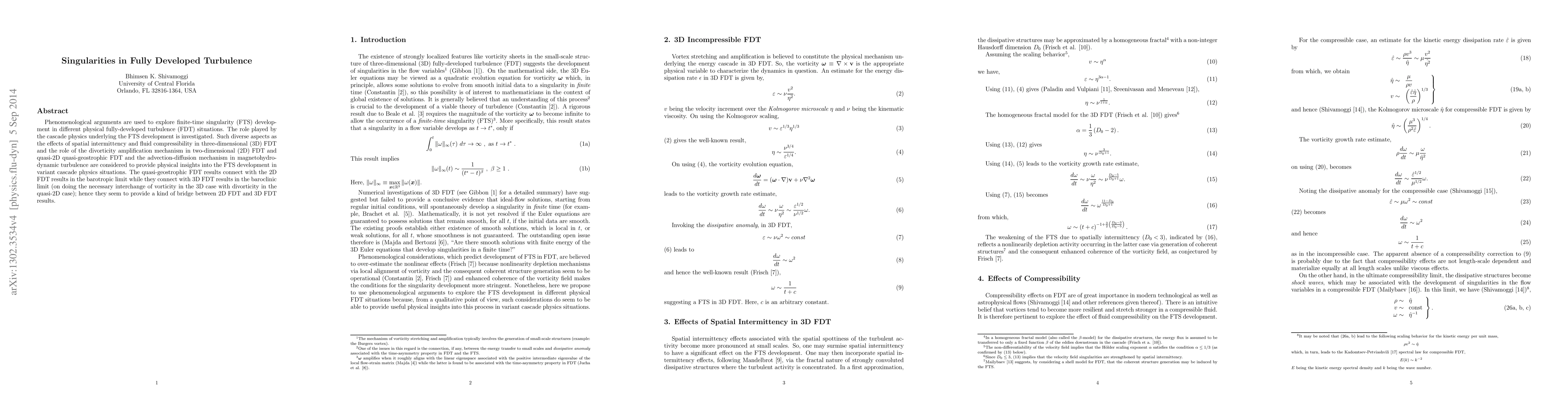 This paper explores the development of finite-time singularities in fully developed turbulence through phenomenological arguments, investigating the cascade physics, spatial intermittency, and fluid compressibility effects in 3D turbulence, and the role of divorticity in 2D and quasi-2D turbulence. The findings suggest a bridge between 2D and 3D turbulence results via quasi-geostrophic dynamics.