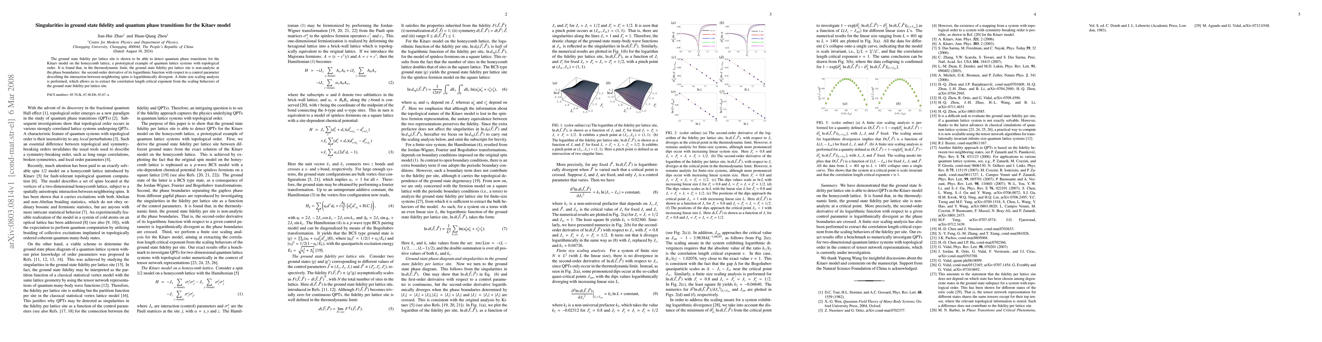 The ground state fidelity per lattice site detects quantum phase transitions in the Kitaev model on the honeycomb lattice, revealing non-analytic behavior at phase boundaries with logarithmic divergence in the second-order derivative. Finite size scaling analysis extracts the correlation length critical exponent.