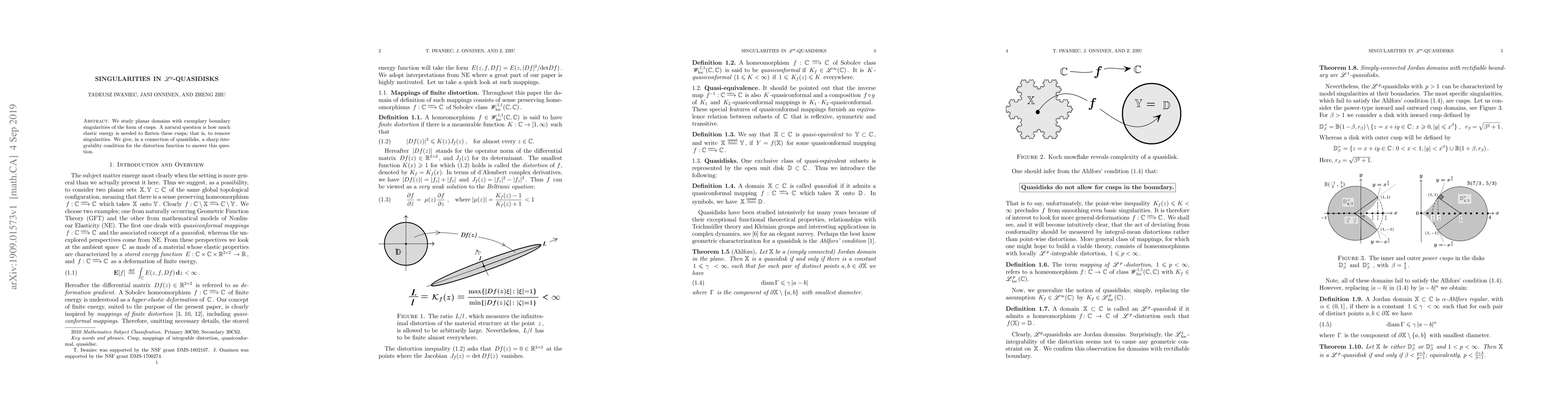 We study planar domains with exemplary boundary singularities of the form of cusps. A natural question is how much elastic energy is needed to flatten these cusps; that is, to remove singularities. We give, in a connection of quasidisks, a sharp integrability condition for the distortion function to answer this ques tion.