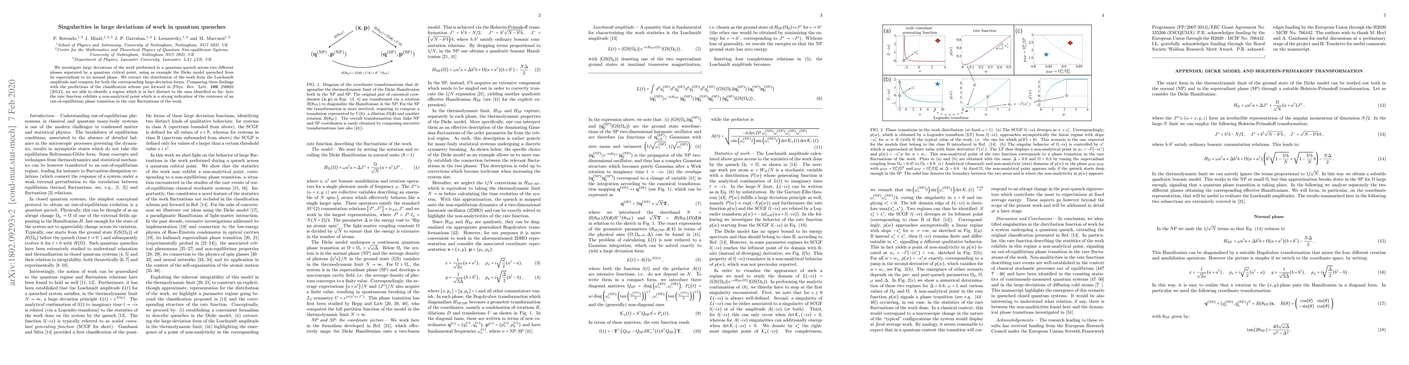 We investigate large deviations of the work performed in a quantum quench across two different phases separated by a quantum critical point, using as example the Dicke model quenched from its superradiant to its normal phase. We extract the distribution of the work from the Loschmidt amplitude and compute for both the corresponding large-deviation forms. Comparing these findings with the predictions of the classification scheme put forward in [Phys. Rev. Lett. 109, 250602 (2012)], we are able to identify a regime which is in fact distinct to the ones identified so far: here the rate function exhibits a non-analytical point which is a strong indication of the existence of an out-of-equilibrium phase transition in the rare fluctuations of the work.