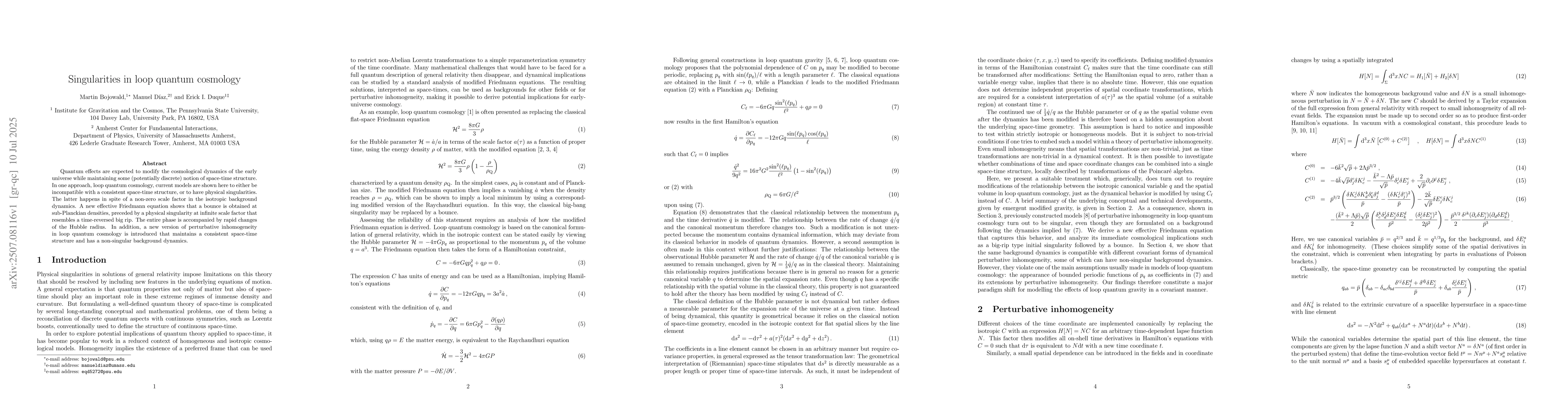 Quantum effects are expected to modify the cosmological dynamics of the early universe while maintaining some (potentially discrete) notion of space-time structure. In one approach, loop quantum cosmology, current models are shown here to either be incompatible with a consistent space-time structure, or to have physical singularities. The latter happens in spite of a non-zero scale factor in the isotropic background dynamics. A new effective Friedmann equation shows that a bounce is obtained at sub-Planckian densities, preceded by a physical singularity at infinite scale factor that resembles a time-reversed big rip. The entire phase is accompanied by rapid changes of the Hubble radius. In addition, a new version of perturbative inhomogeneity in loop quantum cosmology is introduced that maintains a consistent space-time structure and has a non-singular background dynamics.