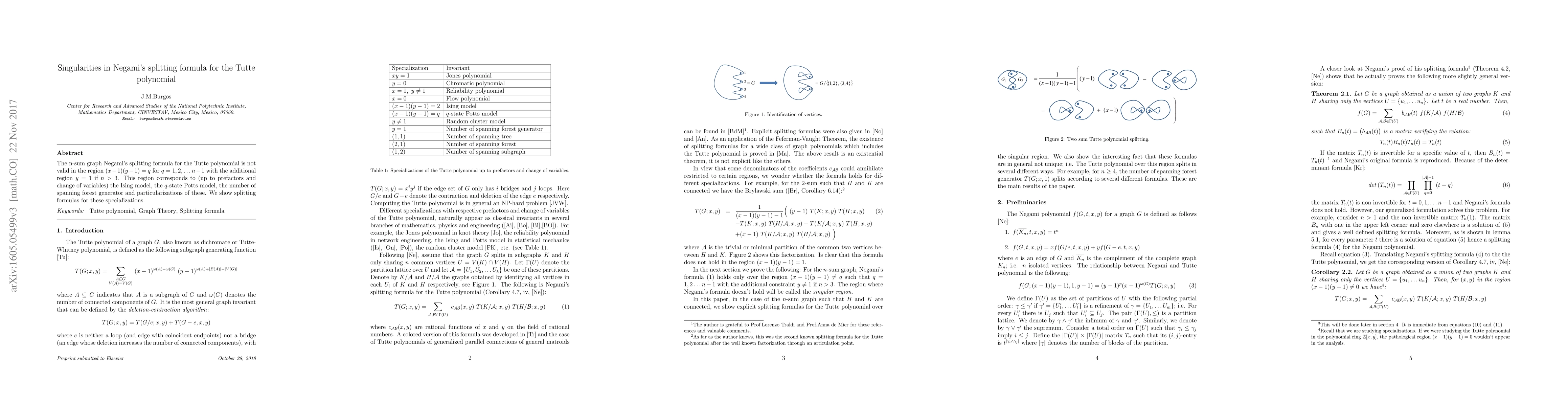 The paper identifies singularities in Negami's splitting formula for the Tutte polynomial in specific regions, particularly when $(x-1)(y-1)=q$ for $q=1,2,\ldots n-1$ and $y=1$ if $n>3$. It provides alternative splitting formulas for the Ising model and $q$-state Potts model.