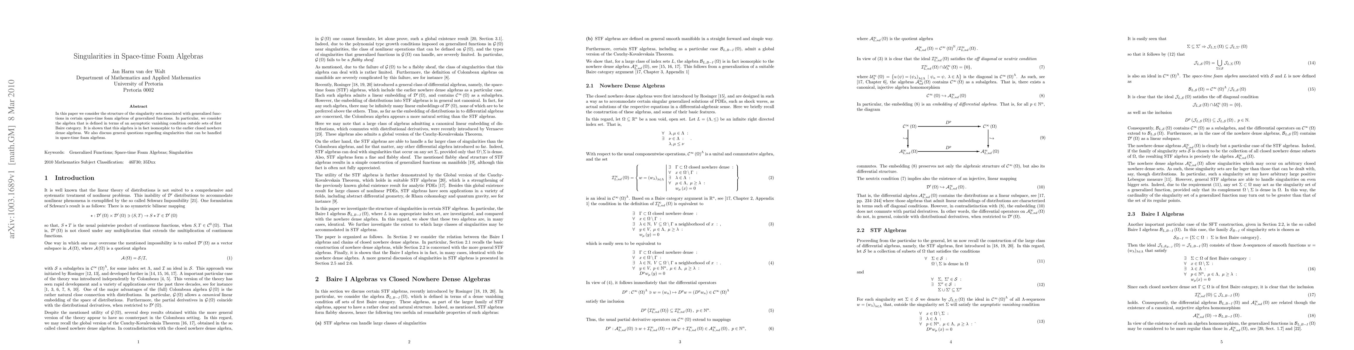 In this paper we consider the structure of the singularity sets associated with generalized functions in certain space-time foam algebras of generalized functions. In particular, we consider the algebra that is defined in terms of an asymptotic vanishing condition outside sets of first Baire category. It is shown that this algebra is in fact isomorphic to the earlier closed nowhere dense algebras. We also discuss general questions regarding singularities that can be handled in space-time foam algebras.