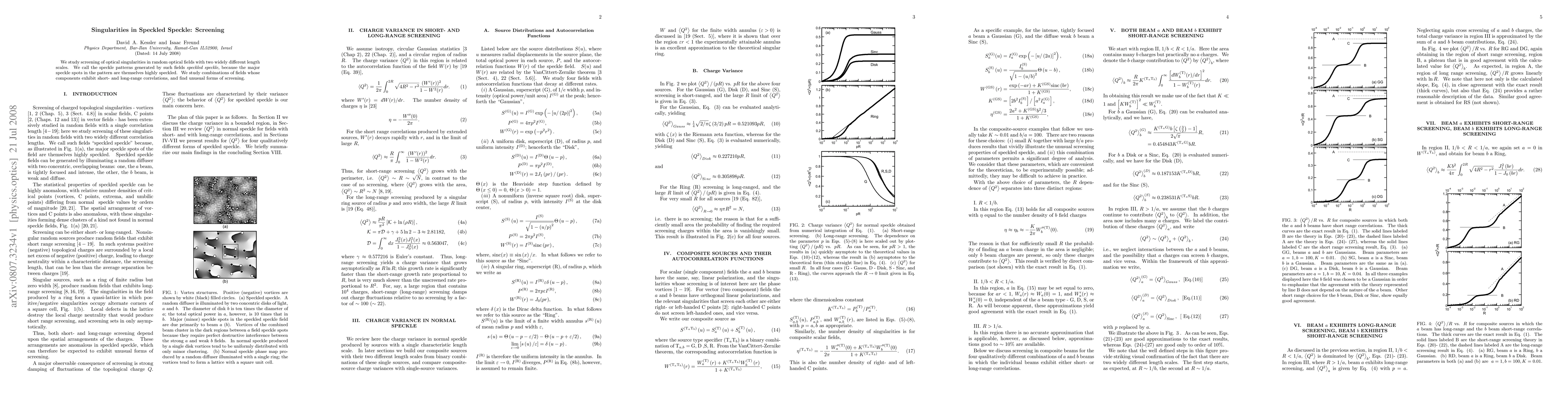 This paper investigates the screening of optical singularities in "speckled speckle" patterns, which arise from random optical fields with distinct length scales. It reveals unusual screening behaviors in fields with both short- and long-range correlations.