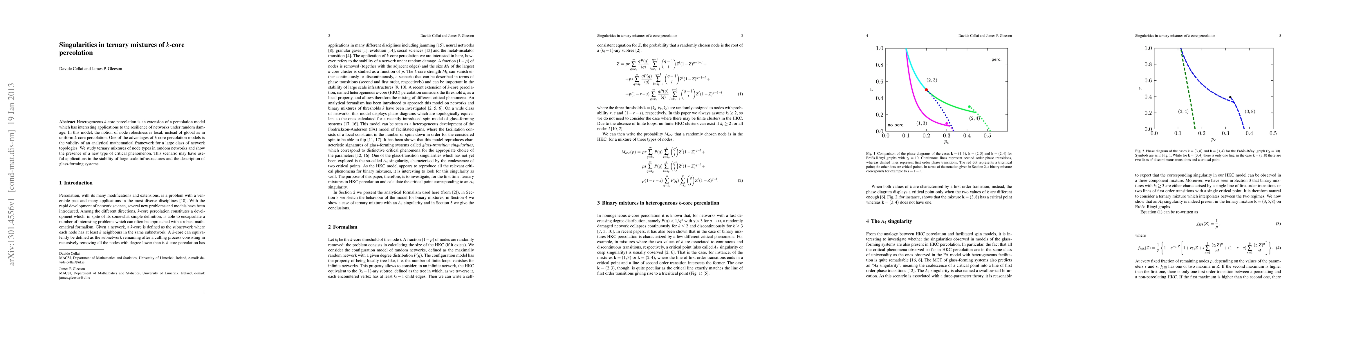 Heterogeneous k-core percolation is an extension of a percolation model which has interesting applications to the resilience of networks under random damage. In this model, the notion of node robustness is local, instead of global as in uniform k-core percolation. One of the advantages of k-core percolation models is the validity of an analytical mathematical framework for a large class of network topologies. We study ternary mixtures of node types in random networks and show the presence of a new type of critical phenomenon. This scenario may have useful applications in the stability of large scale infrastructures and the description of glass-forming systems.