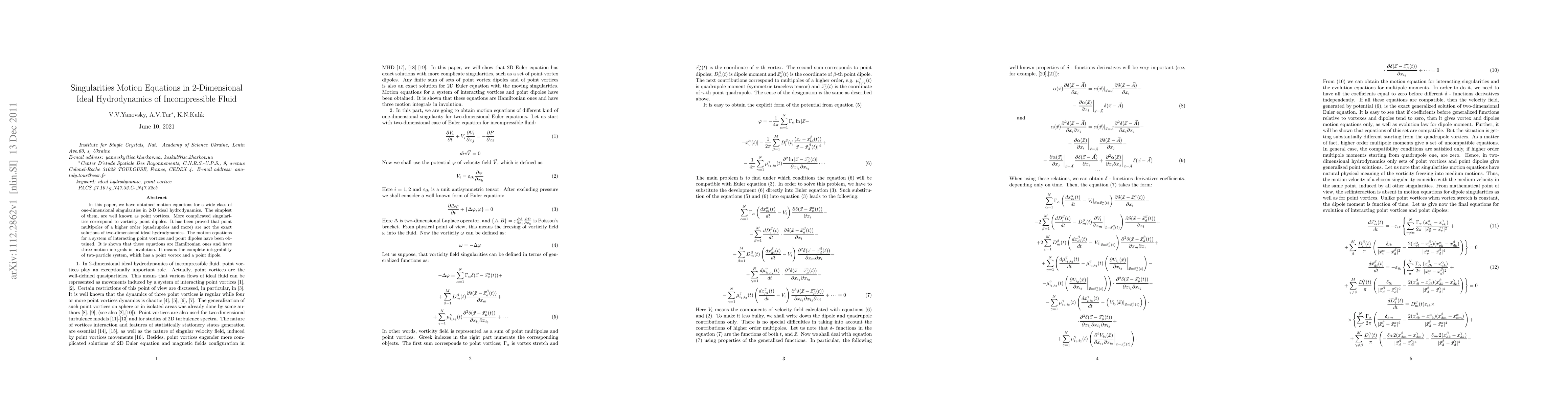 This paper derives motion equations for various singularities in 2-D ideal hydrodynamics, including point vortices and vorticity point dipoles. It proves that higher-order point multipoles are not exact solutions and establishes Hamiltonian equations for systems of interacting point vortices and dipoles, demonstrating complete integrability for a two-particle system.