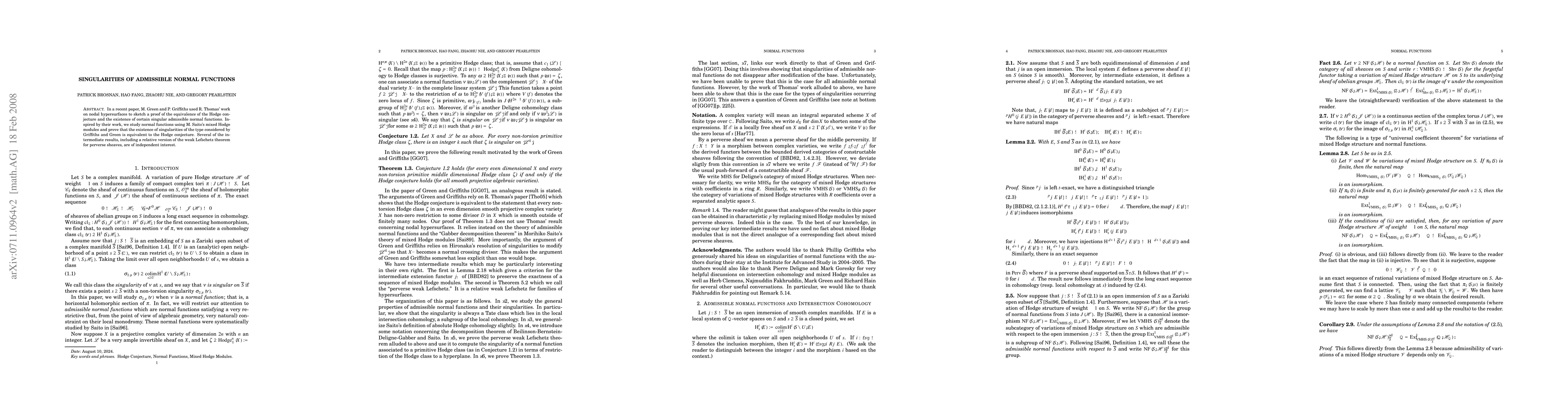In a recent paper, M. Green and P. Griffiths used R. Thomas' works on nodal hypersurfaces to establish the equivalence of the Hodge conjecture and the existence of certain singular admissible normal functions. Inspired by their work, we study normal functions using M. Saito's mixed Hodge modules and prove that the existence of singularities of the type considered by Griffiths and Green is equivalent to the Hodge conjecture. Several of the intermediate results, including a relative version of the weak Lefschetz theorem for perverse sheaves, are of independent interest.