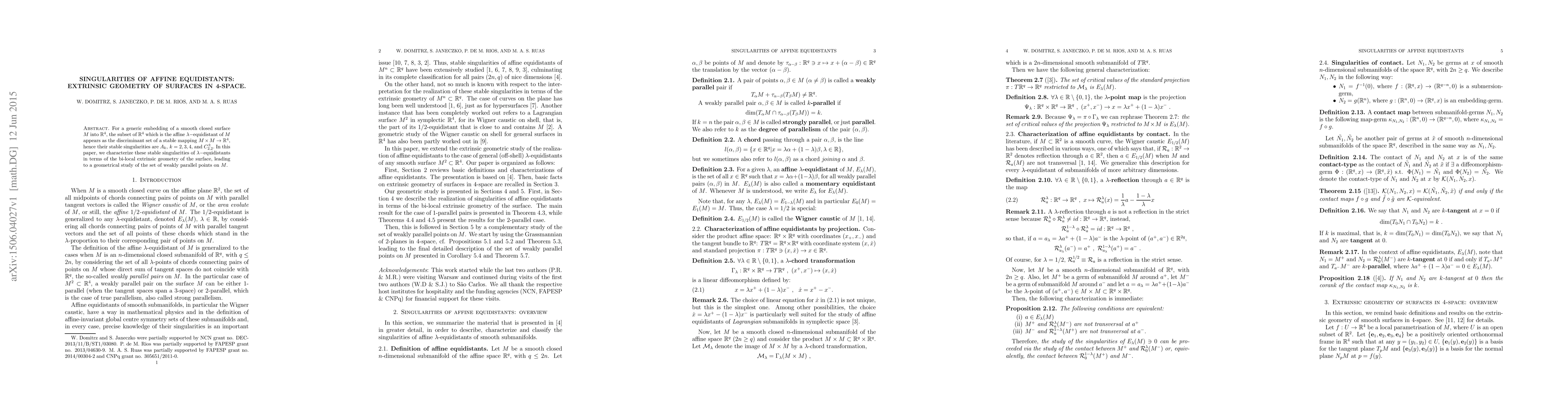 Research characterizes singularities of affine equidistants on a surface in 4-space, revealing geometrical connections to the bi-local extrinsic geometry of the surface.