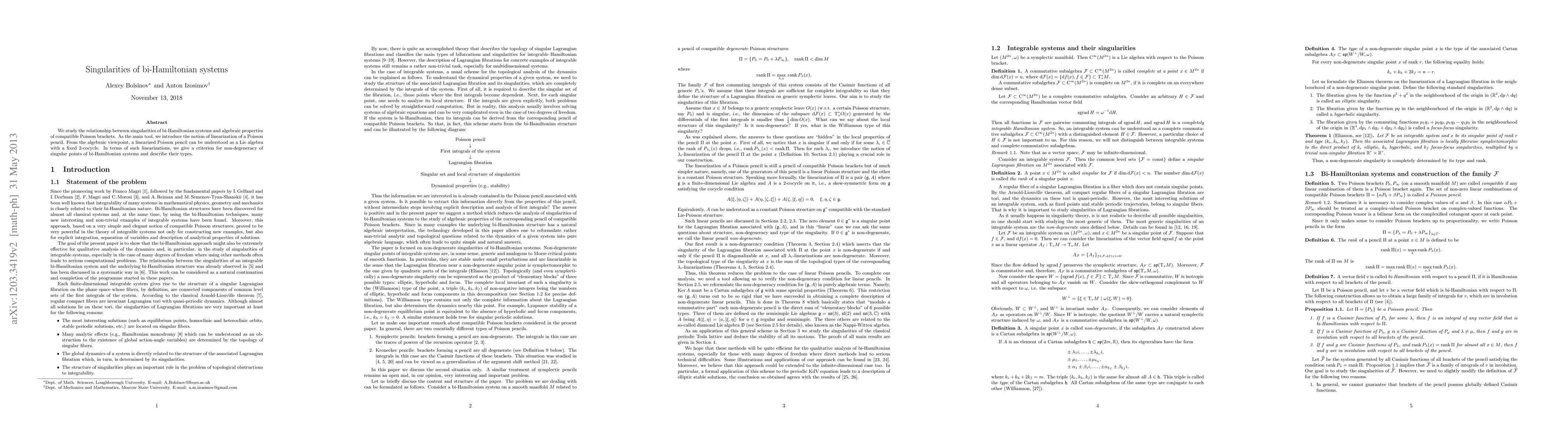 We study the relationship between singularities of bi-Hamiltonian systems and algebraic properties of compatible Poisson brackets. As the main tool, we introduce the notion of linearization of a Poisson pencil. From the algebraic viewpoint, a linearized Poisson pencil can be understood as a Lie algebra with a fixed 2-cocycle. In terms of such linearizations, we give a criterion for non-degeneracy of singular points of bi-Hamiltonian systems and describe their types.