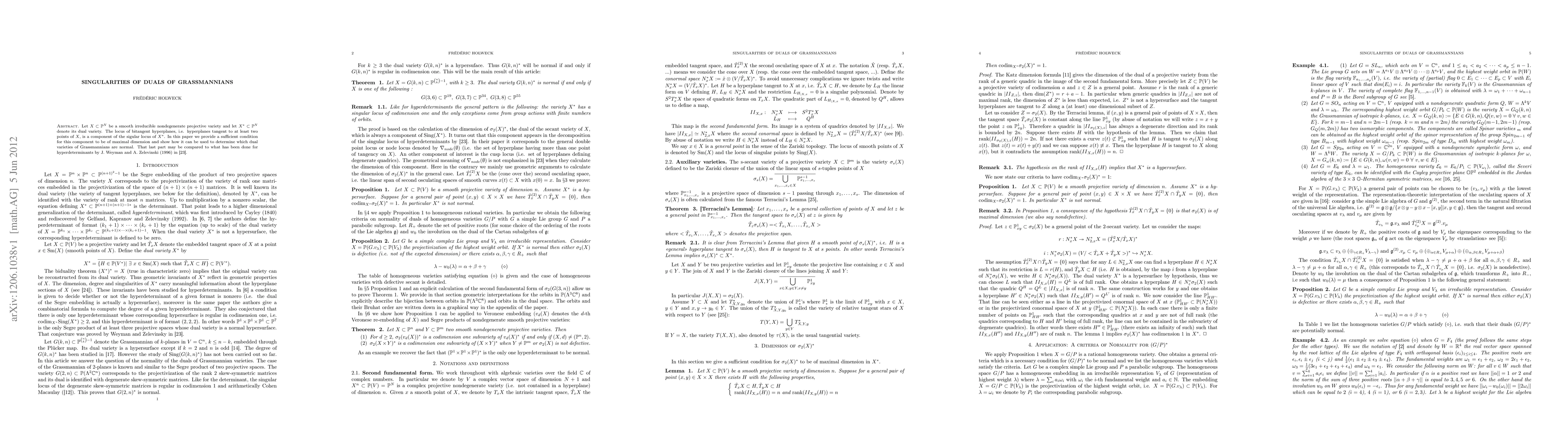 This paper studies singularities of duals of Grassmannians, focusing on a condition for maximal dimensionality in the locus of bitangent hyperplanes, with implications for determining normality of dual varieties.