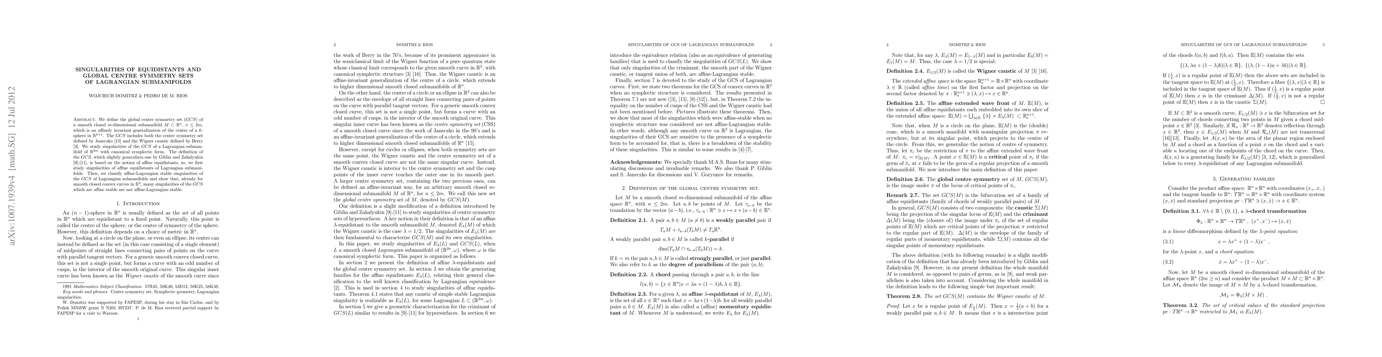 Researchers develop a method to study singularities of Lagrangian submanifolds, focusing on global centre symmetry sets, which include both the centre symmetry set and Wigner caustic, and classify stable singularities in various cases.