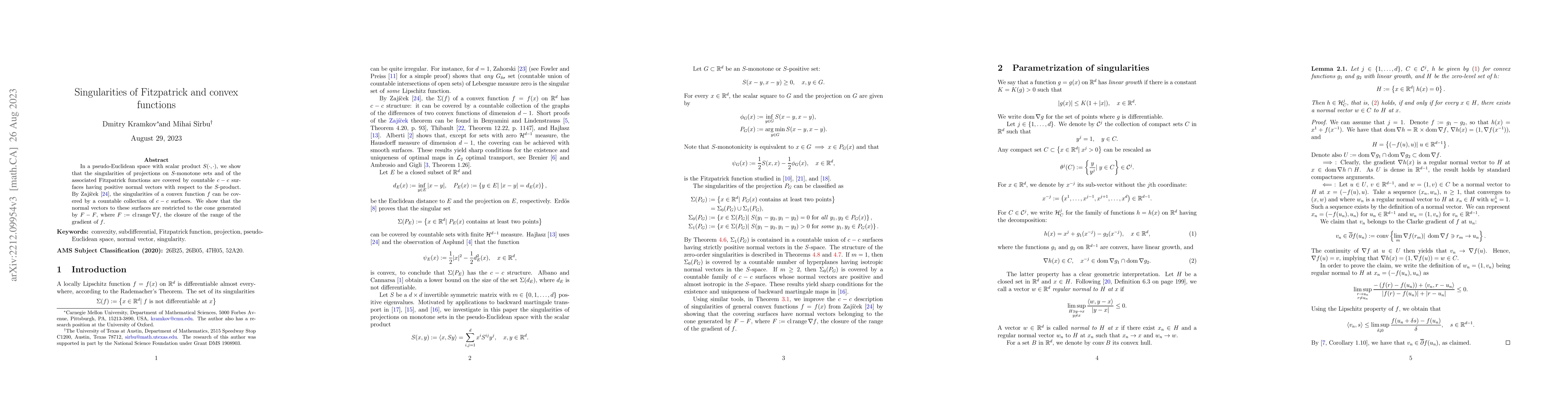 In a pseudo-Euclidean space with scalar product $S(\cdot, \cdot)$, we show that the singularities of projections on $S$-monotone sets and of the associated Fitzpatrick functions are covered by countable $c-c$ surfaces having positive normal vectors with respect to the $S$-product. By Zaj\'{\i}\v{c}ek [24], the singularities of a convex function $f$ can be covered by a countable collection of $c-c$ surfaces. We show that the normal vectors to these surfaces are restricted to the cone generated by $F-F$, where $F:=\text{cl range } \nabla f$, the closure of the range of the gradient of $f$.