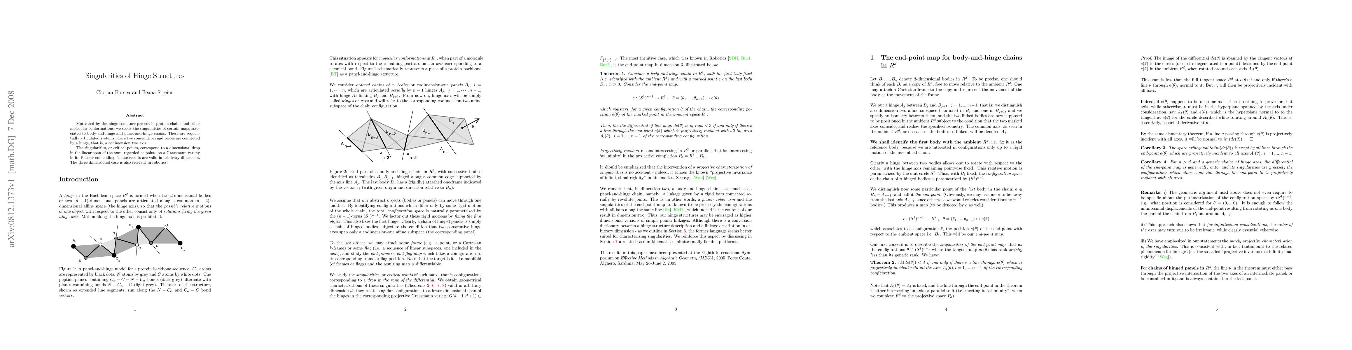 This research investigates singularities in hinge structures, found in protein chains and molecular conformations, by analyzing maps of body-and-hinge and panel-and-hinge chains. Singularities, or critical points, are identified as dimensional drops in the linear span of hinge axes on Grassmann varieties. The findings apply to any dimension, with significant implications for three-dimensional robotics.