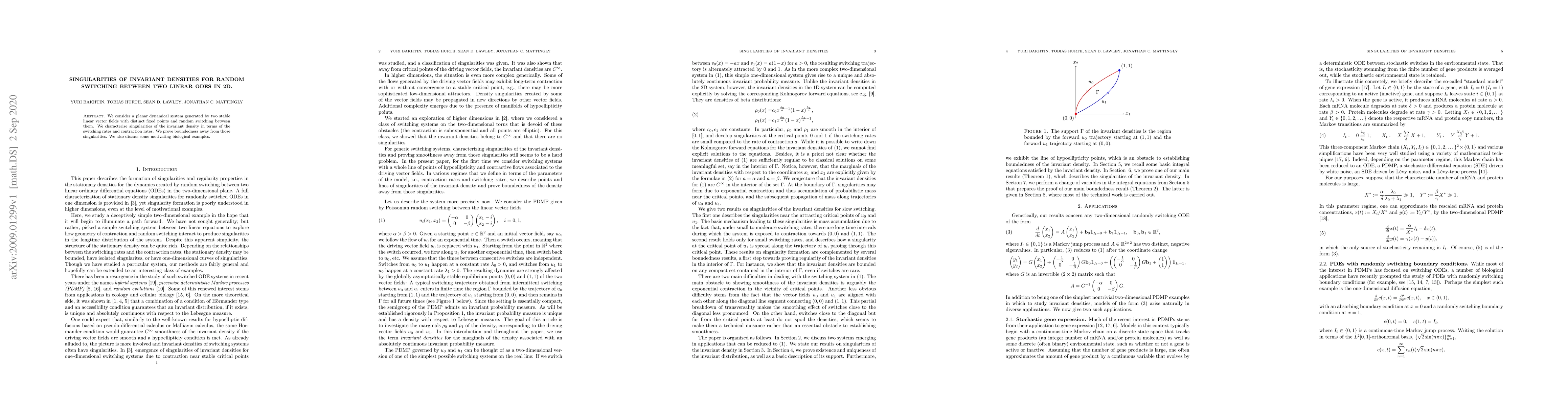 We consider a planar dynamical system generated by two stable linear vector fields with distinct fixed points and random switching between them. We characterize singularities of the invariant density in terms of the switching rates and contraction rates. We prove boundedness away from those singularities. We also discuss some motivating biological examples.