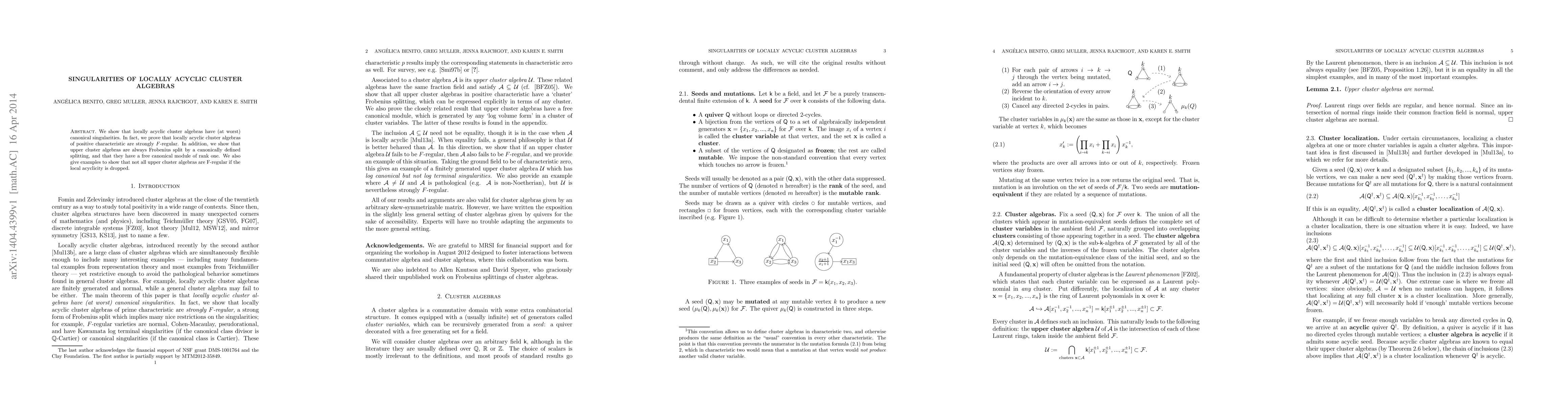 We show that locally acyclic cluster algebras have (at worst) canonical singularities. In fact, we prove that locally acyclic cluster algebras of positive characteristic are strongly F-regular. In addition, we show that upper cluster algebras are always Frobenius split by a canonically defined splitting, and that they have a free canonical module of rank one. We also give examples to show that not all upper cluster algebras are F-regular if the local acyclicity is dropped.
