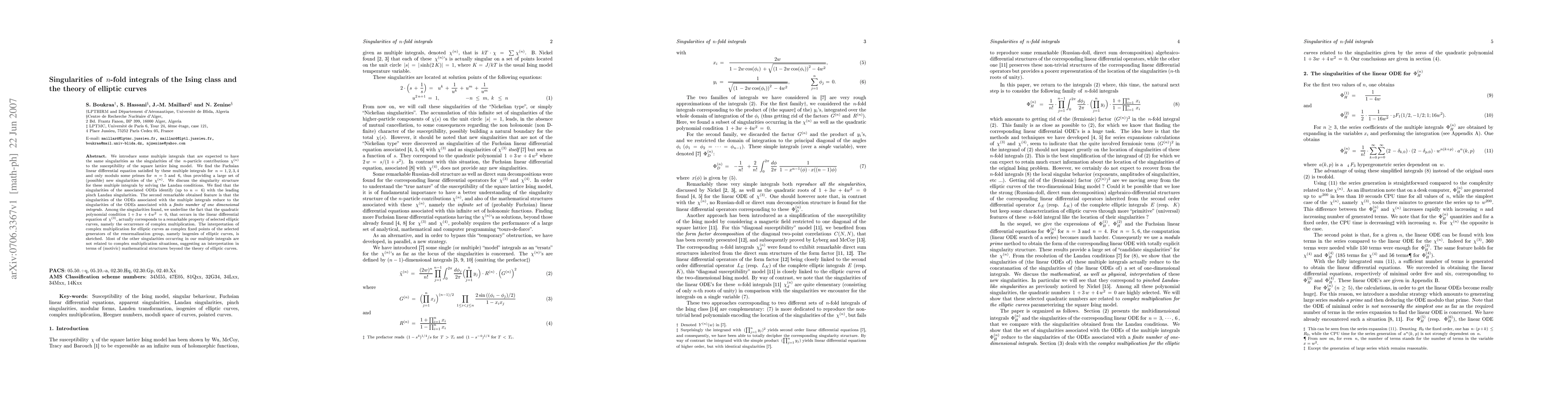 This paper introduces multiple integrals with singularities similar to those in the $n$-particle contributions to the Ising model's susceptibility, deriving Fuchsian differential equations for $n=1$ to $4$ and modulo primes for $n=5$ and $6$. It connects these singularities to leading pinch Landau singularities and elliptic curves, particularly highlighting the complex multiplication property in selected elliptic curves.