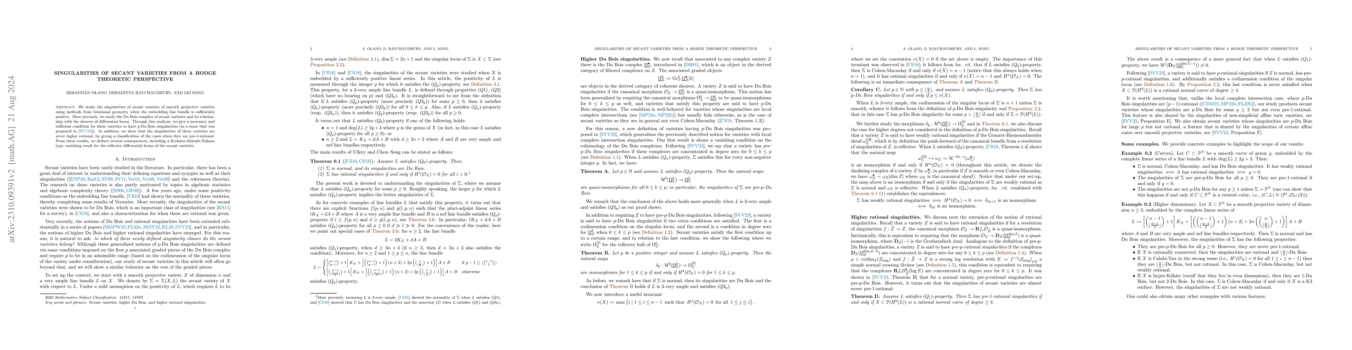 This paper investigates the singularities of secant varieties of smooth projective varieties using birational geometry and Hodge theory, establishing conditions for $p$-Du Bois singularities and proving that they are never higher rational, but can be pre-1-rational. It also derives a Kodaira-Akizuki-Nakano vanishing result for reflexive differential forms.
