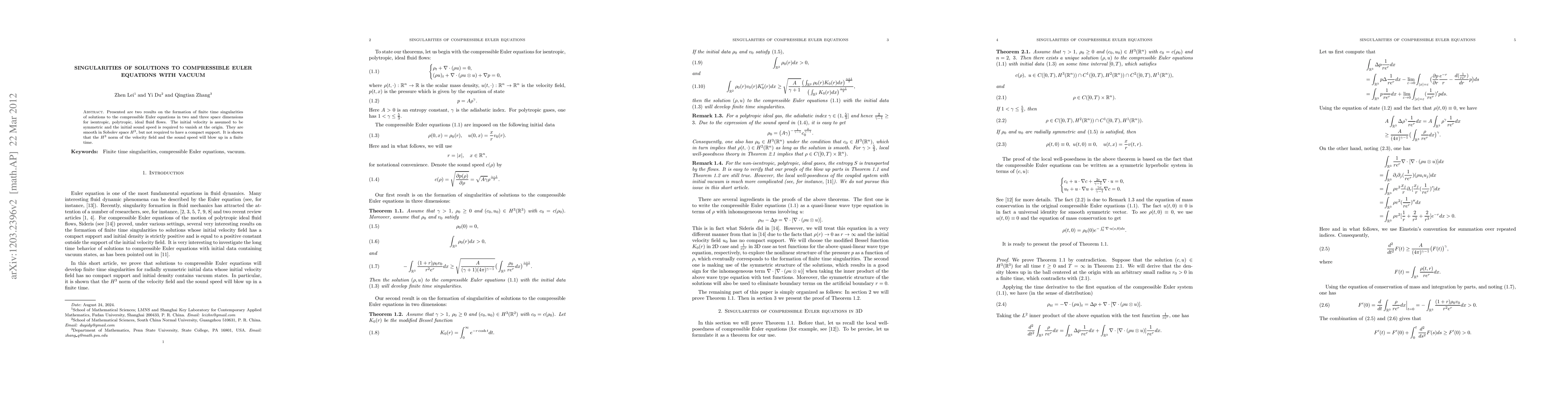 Presented are two results on the formation of finite time singularities of solutions to the compressible Euler equations in two and three space dimensions for isentropic, polytropic, ideal fluid flows. The initial velocity is assumed to be symmetric and the initial sound speed is required to vanish at the origin. They are smooth in Sobolev space $H^3$, but not required to have a compact support. It is shown that the $H^3$ norm of the velocity field and the sound speed will blow up in a finite time.