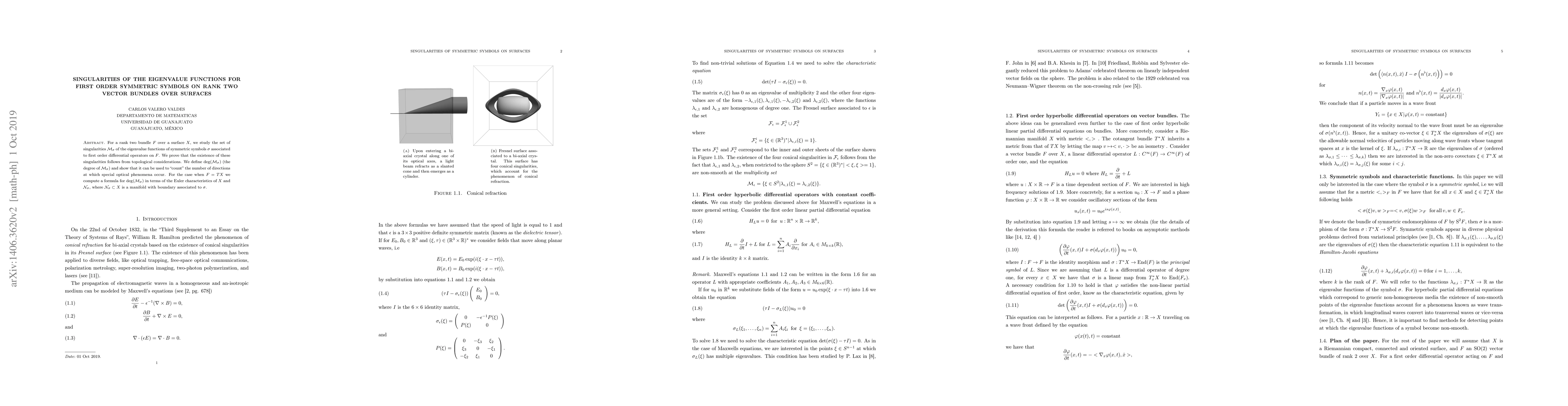 For a rank two bundle $F$ over a surface $X$, we study the set of singularities $M_\sigma$ of the eigenvalue functions of symmetric symbols $\sigma$ associated to first order differential operators on $F$. We prove that the existence of these singularities follows from topological considerations. We define the degree of the set of singularities and show that it can be used to count the number of directions at which special optical phenomena occur. For the case when $F=TX$ we compute a formula for the degree in terms of the Euler characteristics of $X$ and $N_\sigma$, where $N_\sigma\subset X$ is a manifold with boundary associated to $\sigma$.