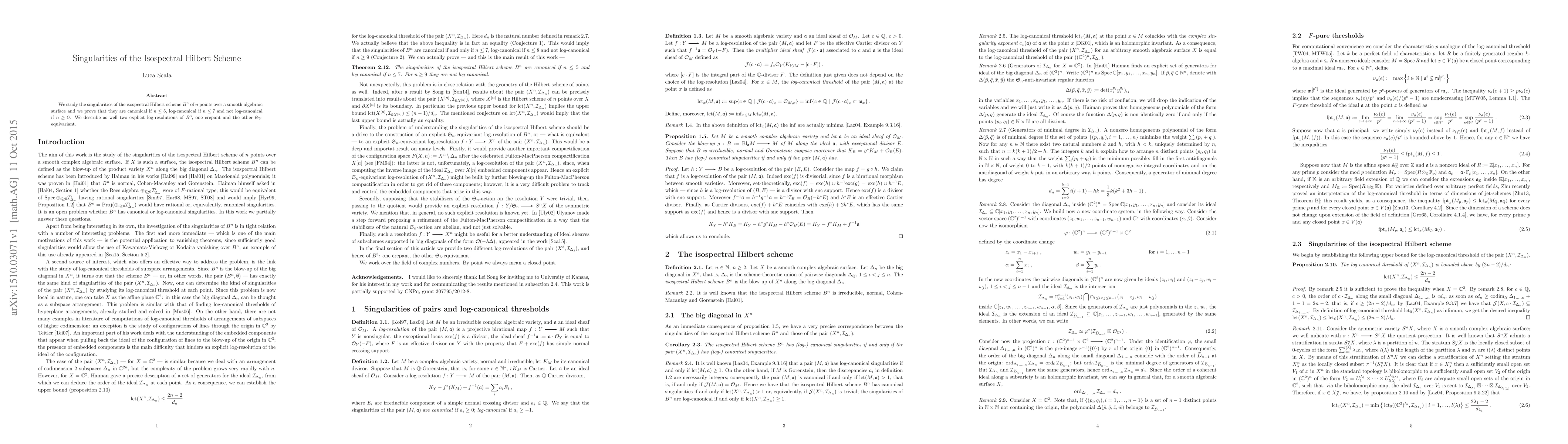 This paper investigates the singularities of the isospectral Hilbert scheme $B^n$ of $n$ points over a smooth algebraic surface, proving that they are canonical for $n \leq 5$, log-canonical for $n \leq 7$, and not log-canonical for $n \geq 9$. It also provides two explicit log-resolutions of $B^3$, one crepant and one $\mathfrak{S}_3$-equivariant.