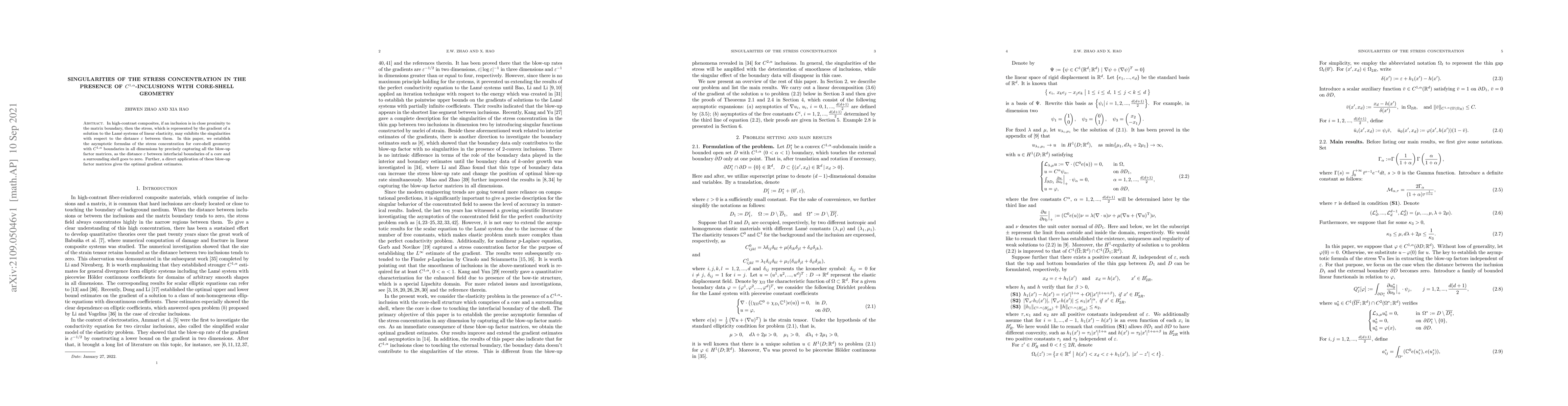 In high-contrast composites, if an inclusion is in close proximity to the matrix boundary, then the stress, which is represented by the gradient of a solution to the Lam\'{e} systems of linear elasticity, may exhibits the singularities with respect to the distance $\varepsilon$ between them. In this paper, we establish the asymptotic formulas of the stress concentration for core-shell geometry with $C^{1,\alpha}$ boundaries in all dimensions by precisely capturing all the blow-up factor matrices, as the distance $\varepsilon$ between interfacial boundaries of a core and a surrounding shell goes to zero. Further, a direct application of these blow-up factor matrices gives the optimal gradient estimates.