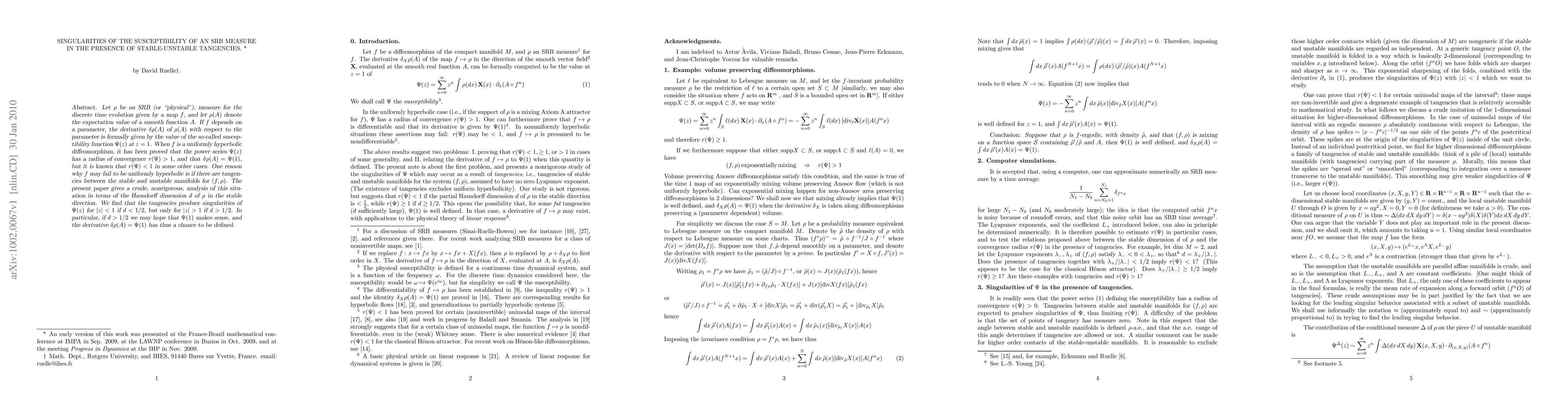 Let $\rho$ be an SRB (or "physical"), measure for the discrete time evolution given by a map $f$, and let $\rho(A)$ denote the expectation value of a smooth function $A$. If $f$ depends on a parameter, the derivative $\delta\rho(A)$ of $\rho(A)$ with respect to the parameter is formally given by the value of the so-called susceptibility function $\Psi(z)$ at $z=1$. When $f$ is a uniformly hyperbolic diffeomorphism, it has been proved that the power series $\Psi(z)$ has a radius of convergence $r(\Psi)>1$, and that $\delta\rho(A)=\Psi(1)$, but it is known that $r(\Psi)<1$ in some other cases. One reason why $f$ may fail to be uniformly hyperbolic is if there are tangencies between the stable and unstable manifolds for $(f,\rho)$. The present paper gives a crude, nonrigorous, analysis of this situation in terms of the Hausdorff dimension $d$ of $\rho$ in the stable direction. We find that the tangencies produce singularities of $\Psi(z)$ for $|z|<1$ if $d<1/2$, but only for $|z|>1$ if $d>1/2$. In particular, if $d>1/2$ we may hope that $\Psi(1)$ makes sense, and the derivative $\delta\rho(A)=\Psi(1)$ has thus a chance to be defined