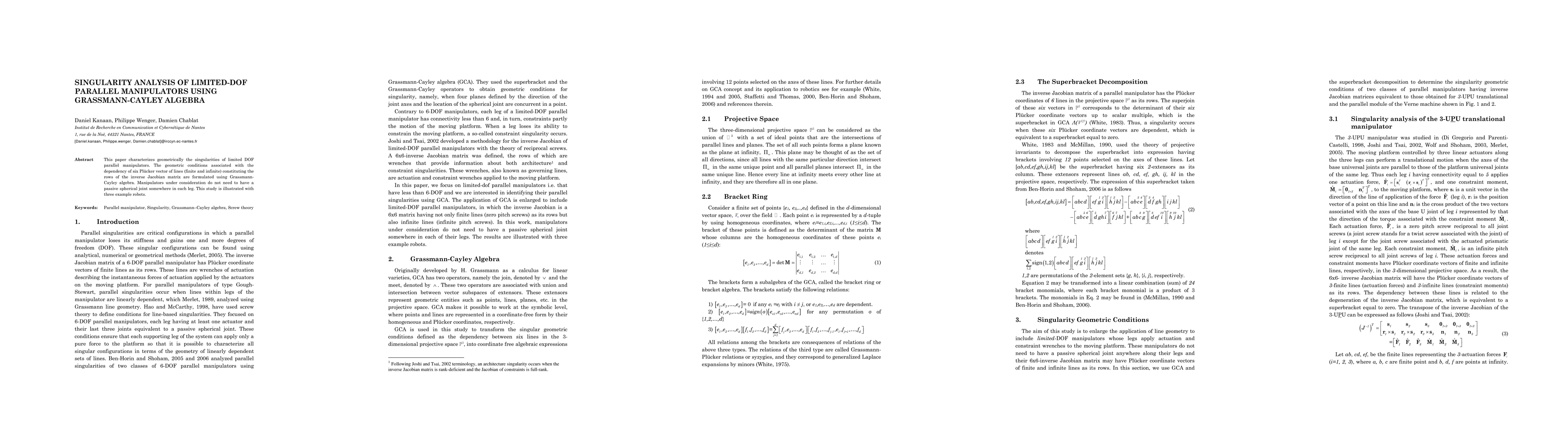 This paper uses Grassmann-Cayley algebra to geometrically characterize singularities in limited-DOF parallel manipulators, focusing on the dependency of the six Plücker vectors of lines forming the inverse Jacobian matrix. Examples demonstrate the method's applicability without requiring a passive spherical joint in each leg.