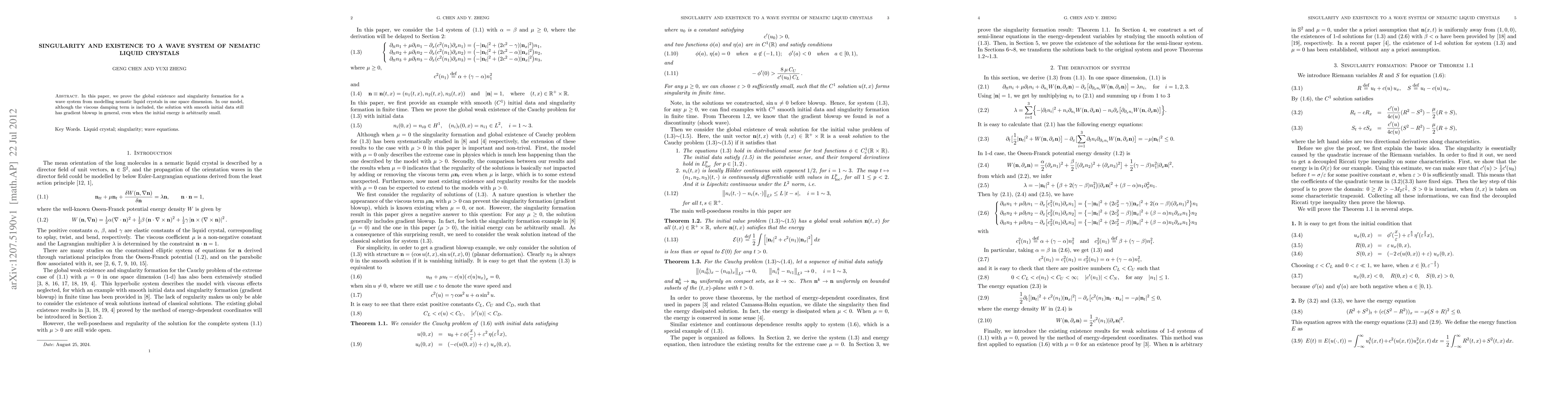 In this paper, we prove the global existence and singularity formation for a wave system from modelling nematic liquid crystals in one space dimension. In our model, although the viscous damping term is included, the solution with smooth initial data still has gradient blowup in general, even when the initial energy is arbitrarily small.