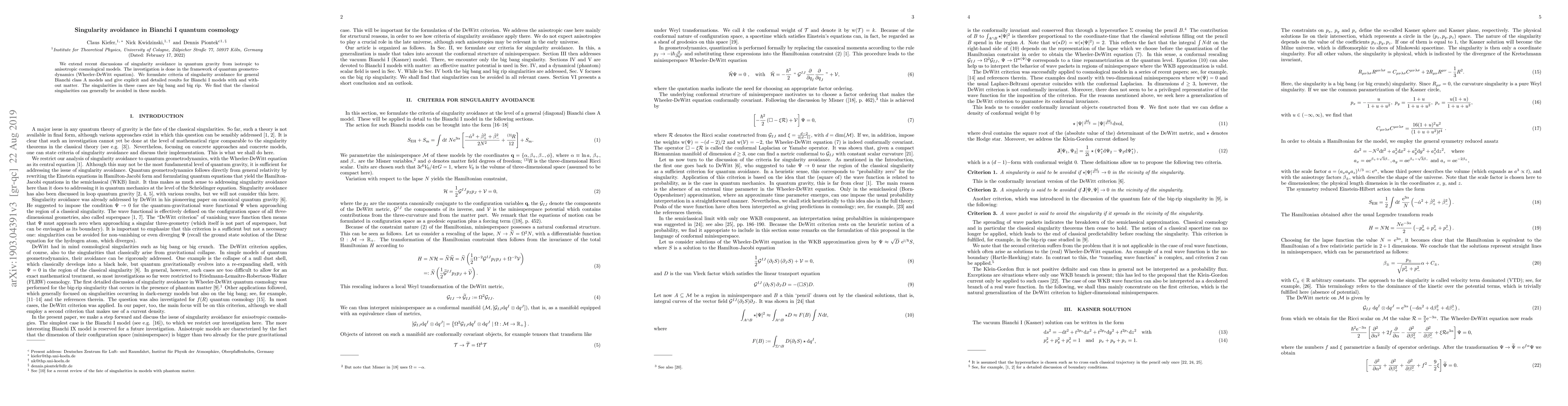 The paper investigates singularity avoidance in anisotropic Bianchi I quantum cosmology using quantum geometrodynamics, finding that classical singularities can typically be avoided in these models. Criteria for singularity avoidance are formulated for general Bianchi class A models, with detailed results presented for Bianchi I models with and without matter.