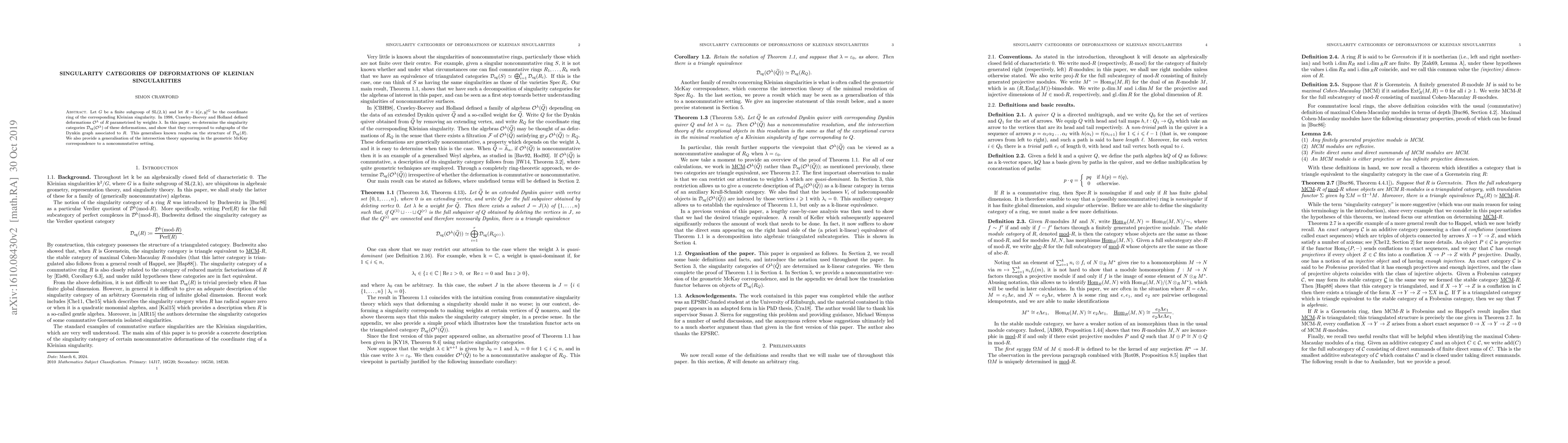 This paper investigates the singularity categories of deformations of Kleinian singularities, determined by finite subgroups of $\text{SL}(2,\Bbbk)$. It shows that these categories correspond to subgraphs of the Dynkin graph associated with the original singularity, generalising previous results.