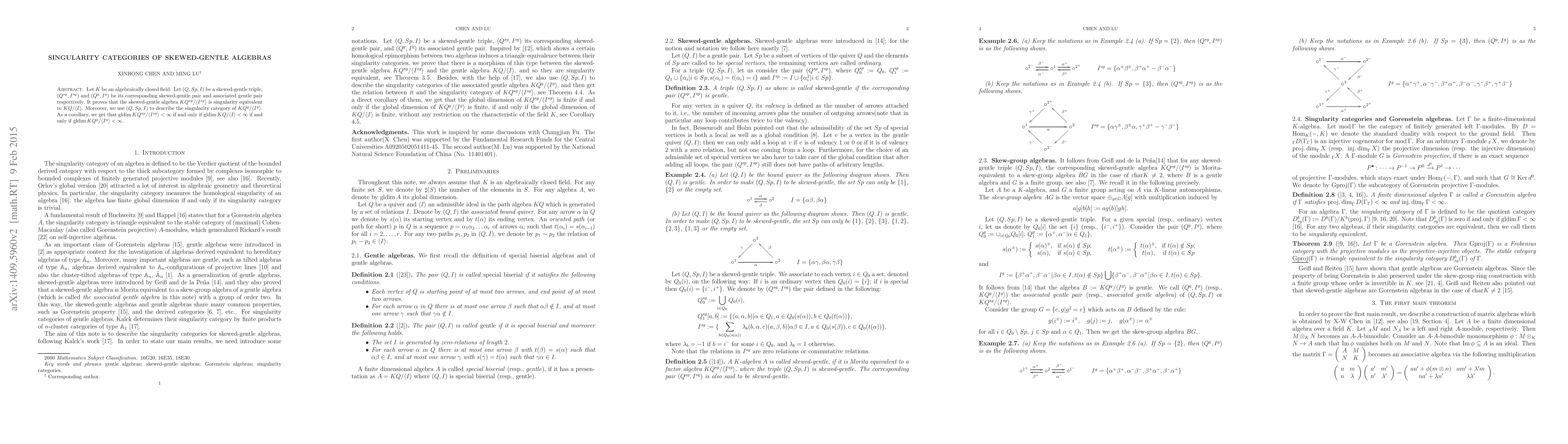 This paper establishes the singularity equivalence between the skewed-gentle algebra $KQ^{sg}/< I^{sg}>$ and $KQ/< I>$, and describes the singularity category of $KQ^g/< I^g>$ using $(Q,Sp,I)$. It concludes that the global dimensions of these algebras are equivalent.