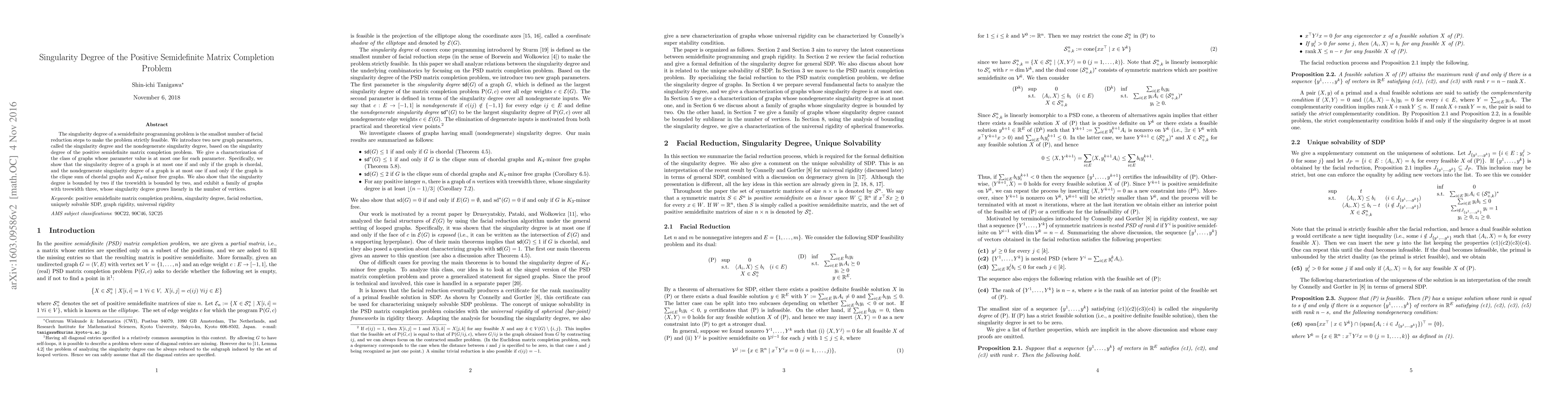 This paper introduces new graph parameters, the singularity degree and the nondegenerate singularity degree, related to the feasibility of semidefinite programming problems. It characterizes chordal graphs as those with a singularity degree of one and shows that the nondegenerate singularity degree of one corresponds to the clique sum of chordal graphs and $K_4$-minor free graphs.