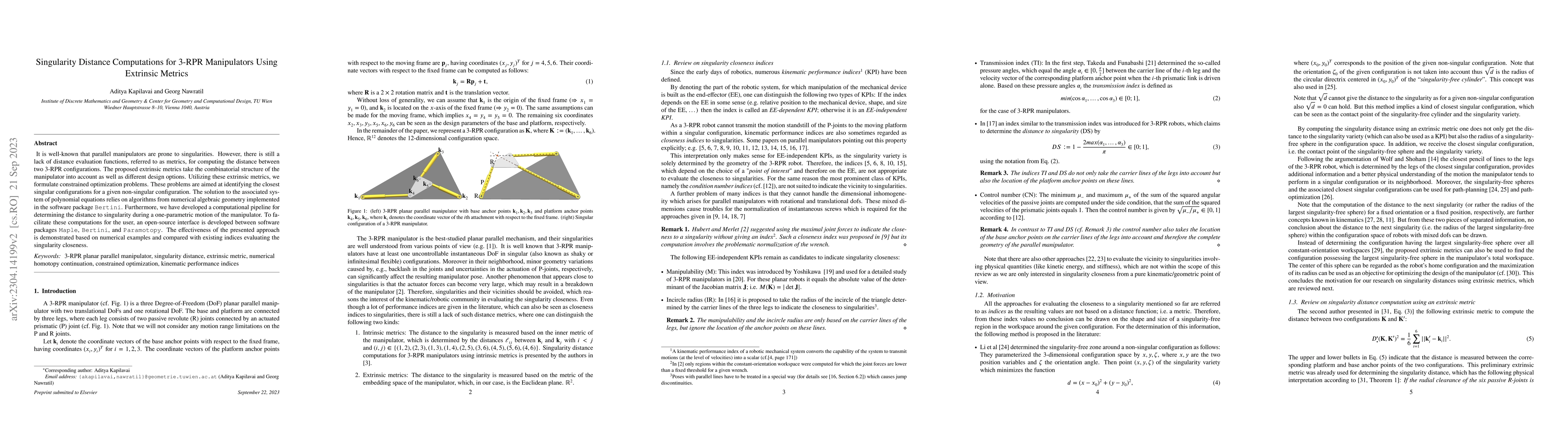 This paper proposes extrinsic metrics to compute the distance to singularity for 3-RPR manipulators, considering their combinatorial structure and design options. It formulates optimization problems to identify the closest singular configurations and uses numerical algebraic geometry algorithms to solve them, demonstrating the approach with an open-source interface linking Maple, Bertini, and Paramotopy.