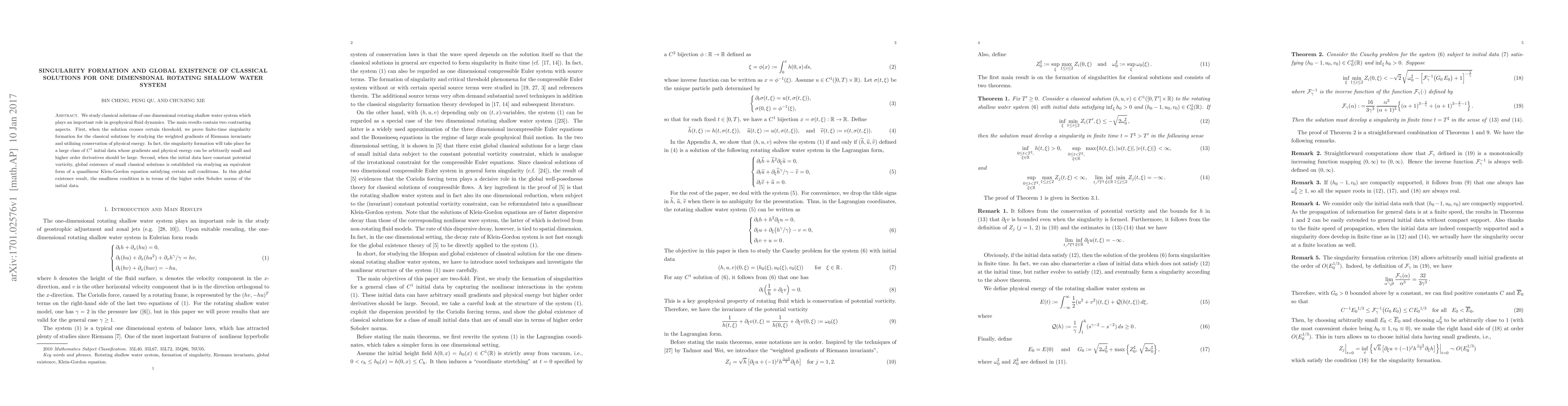 This paper investigates classical solutions for a one-dimensional rotating shallow water system, revealing finite-time singularity formation when solutions exceed a threshold, and establishing global existence for small solutions with constant potential vorticity, using a quasilinear Klein-Gordon equation approach.
