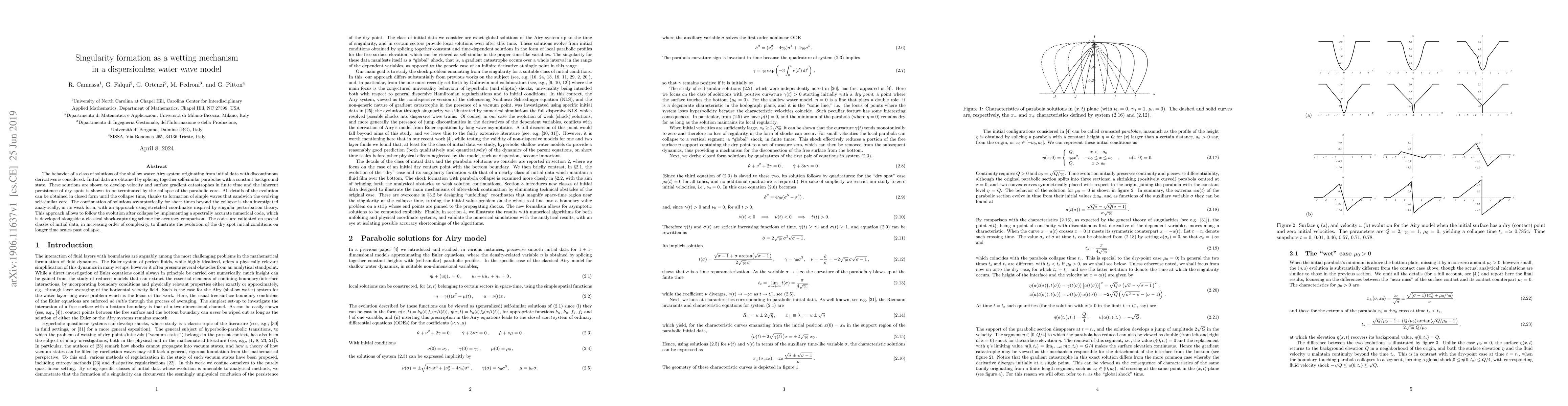 The behavior of a class of solutions of the shallow water Airy system originating from initial data with discontinuous derivatives is considered. Initial data are obtained by splicing together self-similar parabolae with a constant background state. These solutions are shown to develop velocity and surface gradient catastrophes in finite time and the inherent persistence of dry spots is shown to be terminated by the collapse of the parabolic core. All details of the evolution can be obtained in closed form until the collapse time, thanks to formation of simple waves that sandwich the evolving self-similar core. The continuation of solutions asymptotically for short times beyond the collapse is then investigated analytically, in its weak form, with an approach using stretched coordinates inspired by singular perturbation theory. This approach allows to follow the evolution after collapse by implementing a spectrally accurate numerical code, which is developed alongside a classical shock-capturing scheme for accuracy comparison. The codes are validated on special classes of initial data, in increasing order of complexity, to illustrate the evolution of the dry spot initial conditions on longer time scales past collapse.