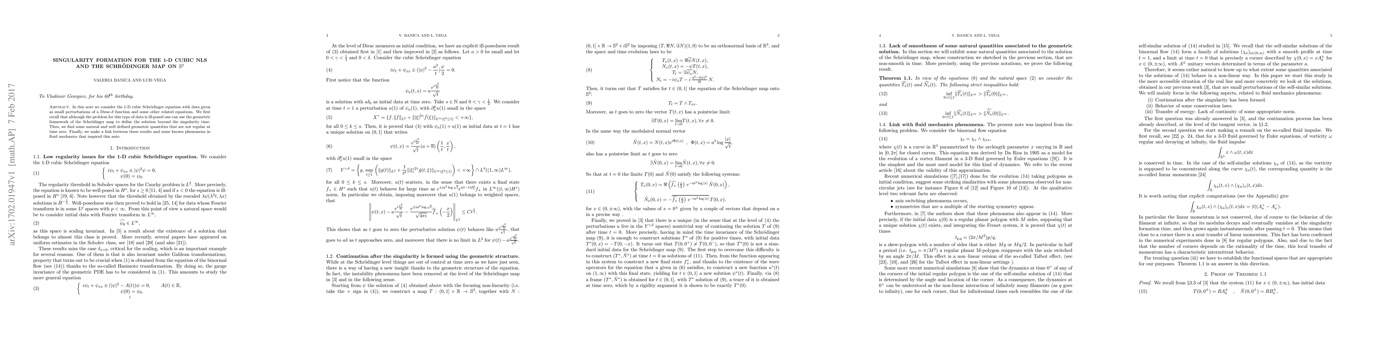 In this note we consider the 1-D cubic Schr\"odinger equation with data given as small perturbations of a Dirac-$\delta$ function and some other related equations. We first recall that although the problem for this type of data is ill-posed one can use the geometric framework of the Schr\"odinger map to define the solution beyond the singularity time. Then, we find some natural and well defined geometric quantities that are not regular at time zero. Finally, we make a link between these results and some known phenomena in fluid mechanics that inspired this note.
