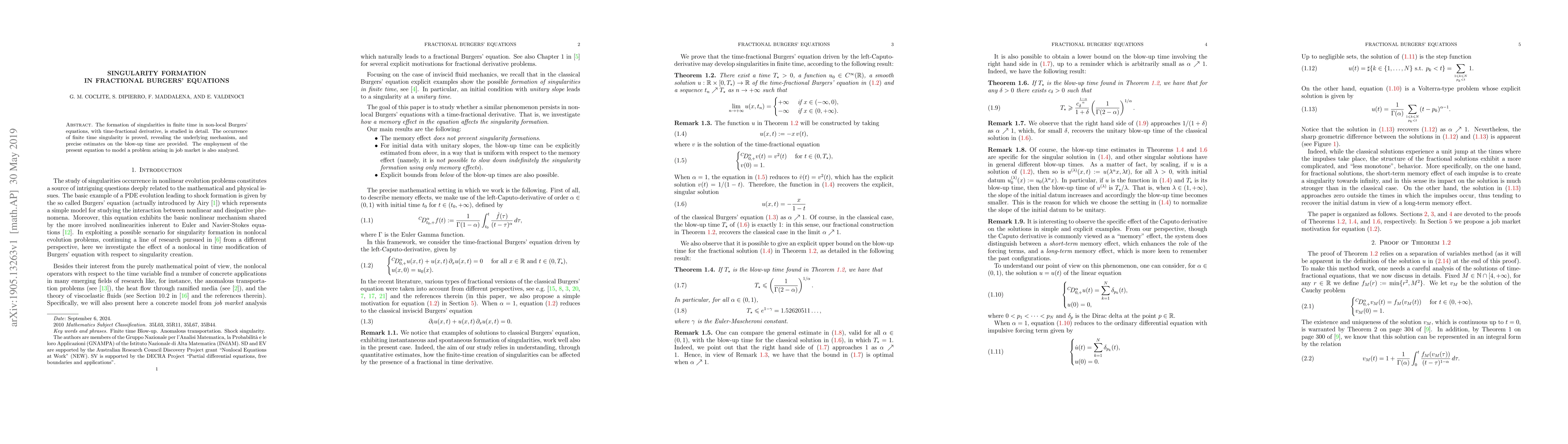 The paper studies the formation of singularities in non-local Burgers' equations with time-fractional derivative, proving their occurrence and providing estimates on blow-up times, which has implications for modeling problems like job market dynamics.