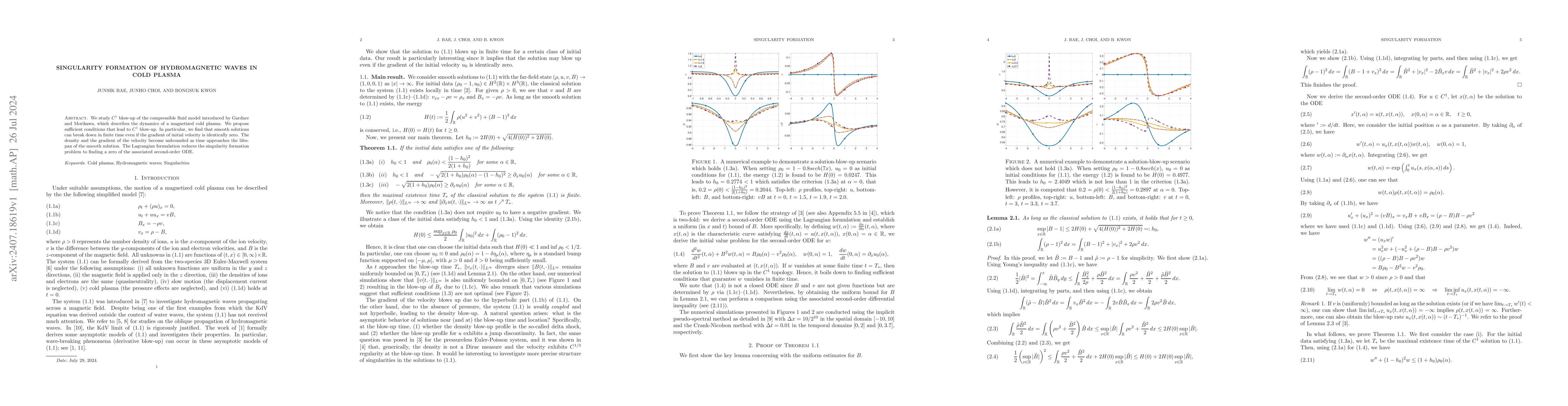 This paper investigates the formation of singularities in hydromagnetic waves within cold plasmas, focusing on the $C^1$ blow-up of a compressible fluid model. It identifies conditions under which smooth solutions can break down in finite time, highlighting the unbounded density and velocity gradient as time approaches the solution's lifespan.