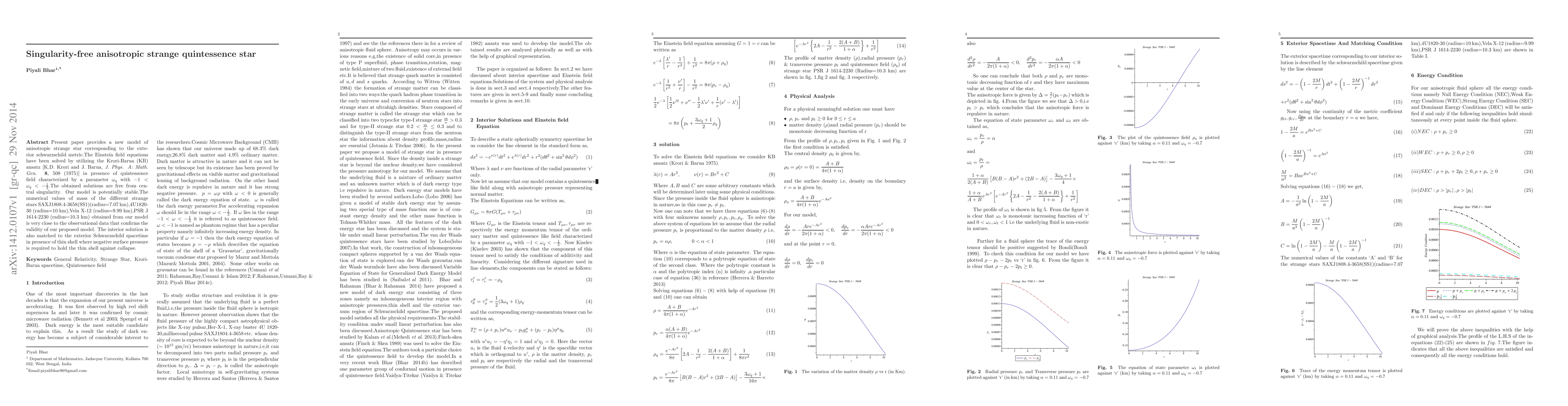 Present paper provides a new model of anisotropic strange star corresponding to the exterior schwarzschild metric. The Einstein field equations have been solved by utilizing the Krori Barua (KB) ansatz in presence of quintessence field characterized by a parameter omegaq . The obtained solutions are free from central singularity. Our model is potentially stable.The numerical values of mass of the different strange stars SAXJ1808.4-3658(SS1)(radius=7.07 km),4U1820- 30 (radius=10 km),Vela X-12 (radius=9.99 km),PSR J 1614-2230 (radius=10.3 km) obtained from our model is very close to the observational data that confirms the validity of our proposed model. The interior solution is also matched to the exterior Schwarzschild spacetime in presence of thin shell where negative surface pressure is required to hold the thin shell against collapse.