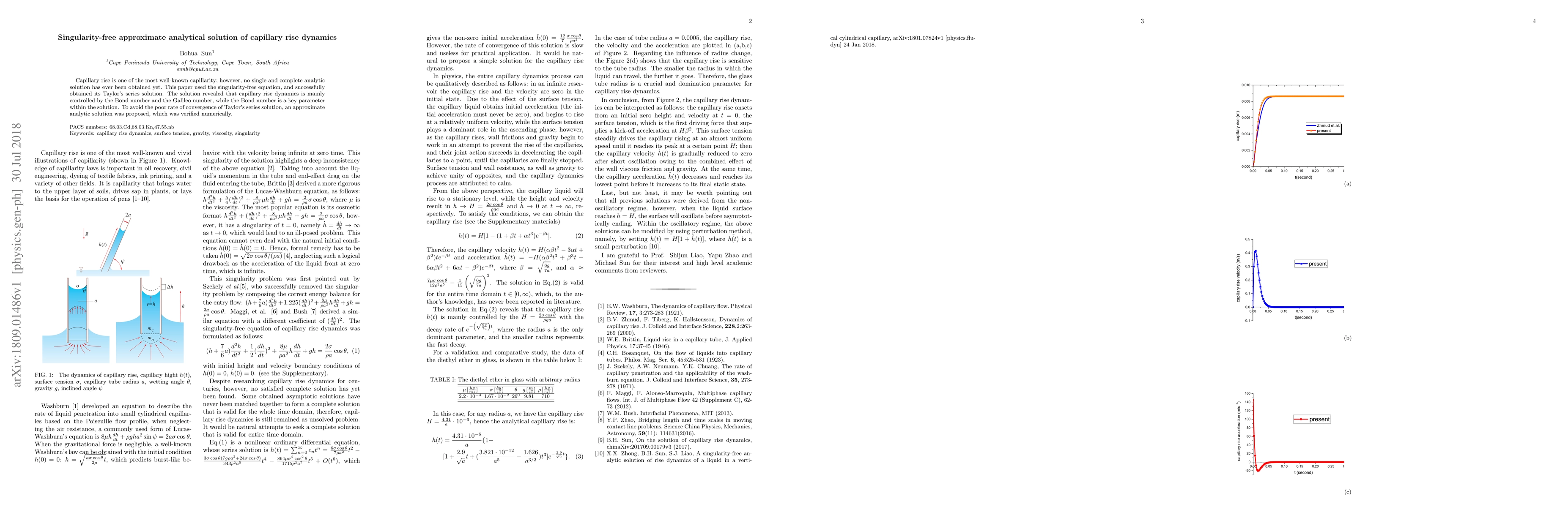 This paper presents a singularity-free Taylor's series solution for capillary rise dynamics, highlighting the Bond number and Galileo number as key parameters. An approximate analytic solution was proposed to improve convergence and was numerically validated.