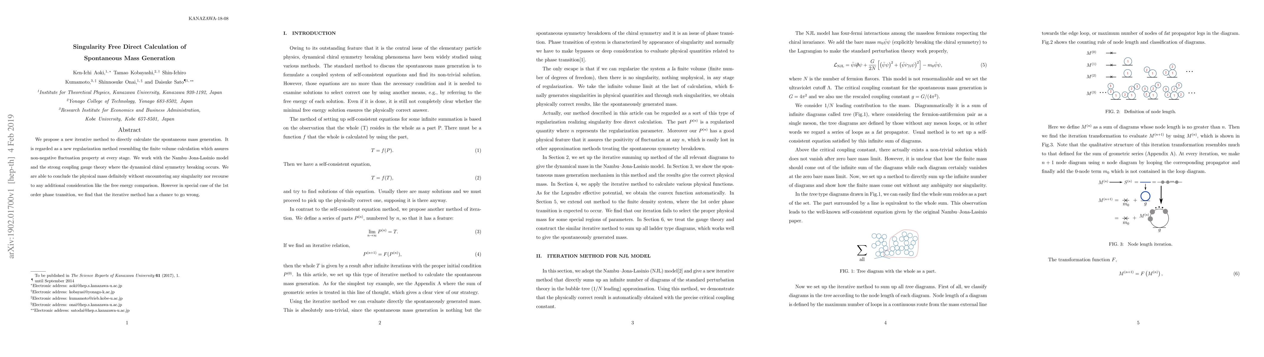 We propose a new iterative method to directly calculate the spontaneous mass generation. It is regarded as a new regularization method resembling the finite volume calculation which assures non-negative fluctuation property at every stage. We work with the Nambu--Jona-Lasinio model and the strong coupling gauge theory where the dynamical chiral symmetry breaking occurs. We are able to conclude the physical mass definitely without encountering any singularity nor recourse to any additional consideration like the free energy comparison. However in special case of the 1st order phase transition, we find that the iterative method has a chance to go wrong.