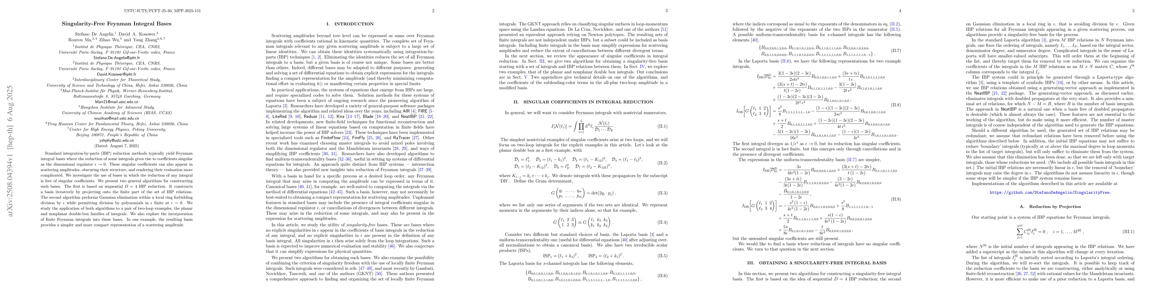Standard integration-by-parts (IBP) reduction methods typically yield Feynman integral bases where the reduction of some integrals gives rise to coefficients singular as the dimensional regulator $\epsilon\rightarrow 0$. These singular coefficients can also appear in scattering amplitudes, obscuring their structure, and rendering their evaluation more complicated. We investigate the use of bases in which the reduction of any integral is free of singular coefficients. We present two general algorithms for constructing such bases. The first is based on sequential $D=4$ IBP reduction. It constructs a basis iteratively by projecting onto the finite part of the set of IBP relations. The second algorithm performs Gaussian elimination within a local ring forbidding division by $\epsilon$ while permitting division by polynomials in $\epsilon$ finite at $\epsilon=0$. We study the application of both algorithms to a pair of two-loop examples, the planar and nonplanar double-box families of integrals. We also explore the incorporation of finite Feynman integrals into these bases. In one example, the resulting basis provides a simpler and more compact representation of a scattering amplitude.