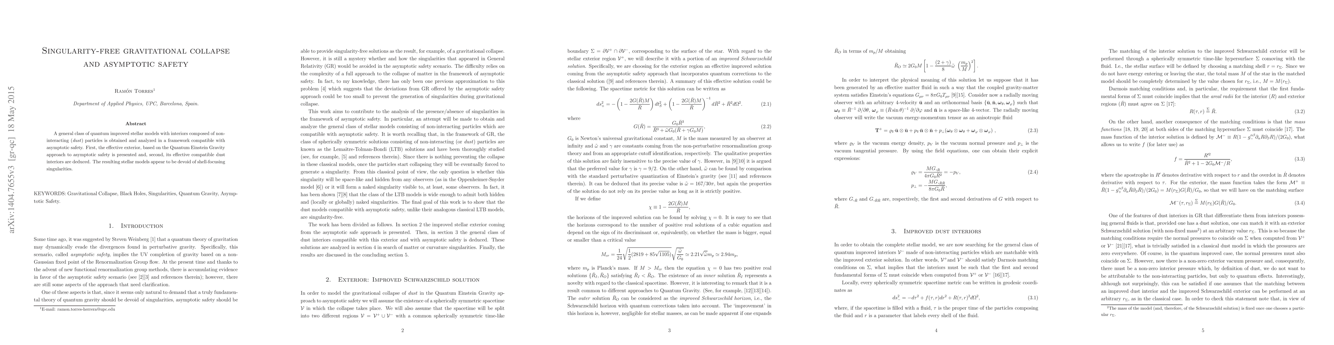 This paper develops quantum-improved stellar models based on non-interacting particles within a framework of asymptotic safety, presenting effective exteriors and compatible interiors that avoid shell-focusing singularities. The approach aligns with Quantum Einstein Gravity to achieve singularity-free gravitational collapse.